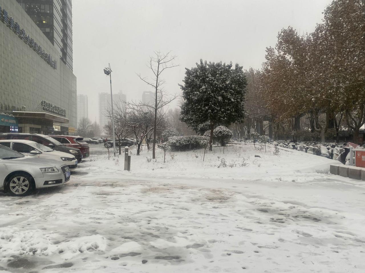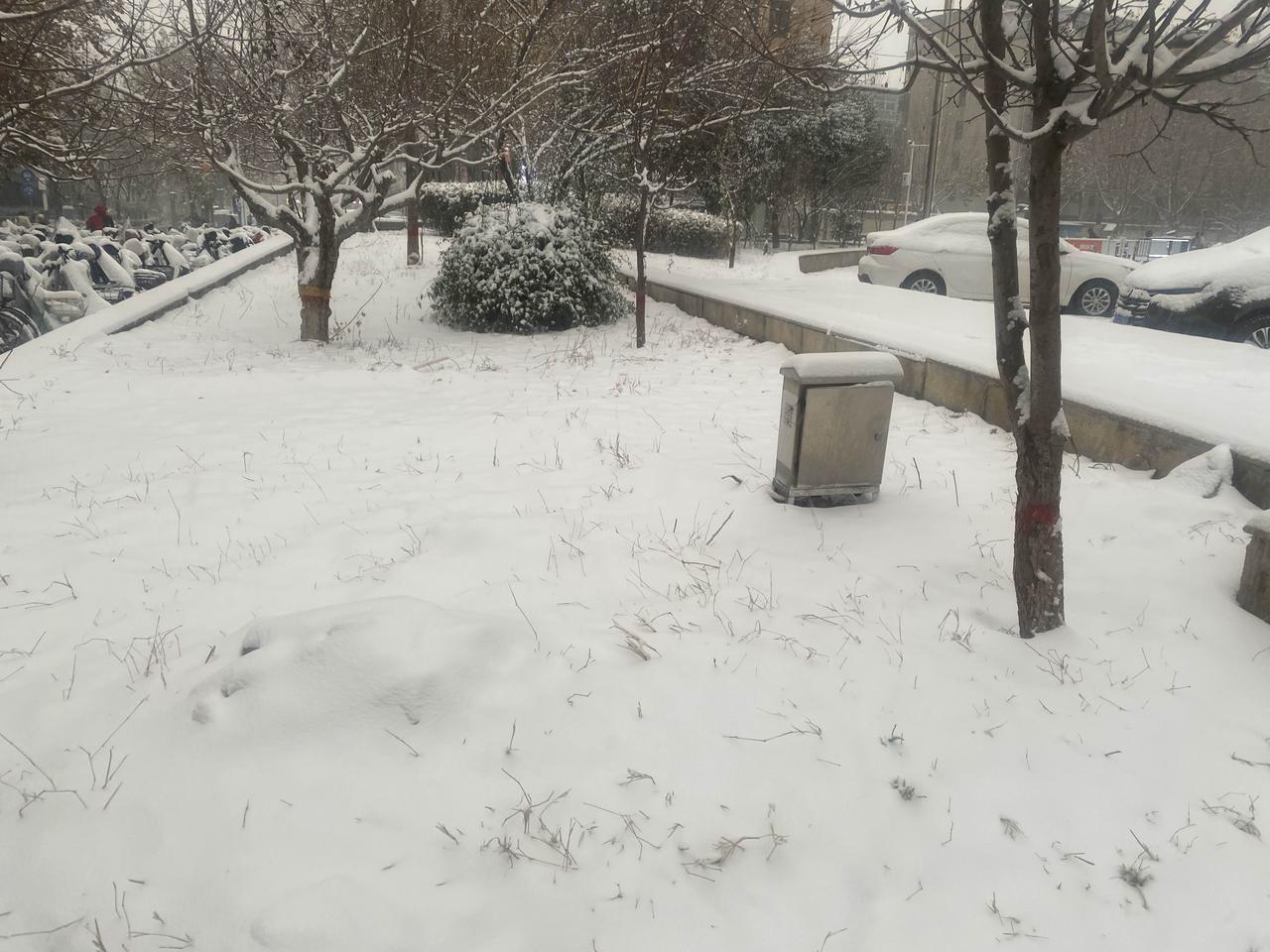 石家庄头一次下大雪, 飘飘洒洒, 绵绵不绝, 落满街头。 锁藏尘埃, 罩住车辆, 给绿叶搓粉、大地着装。 素裹天下, 银装人间。