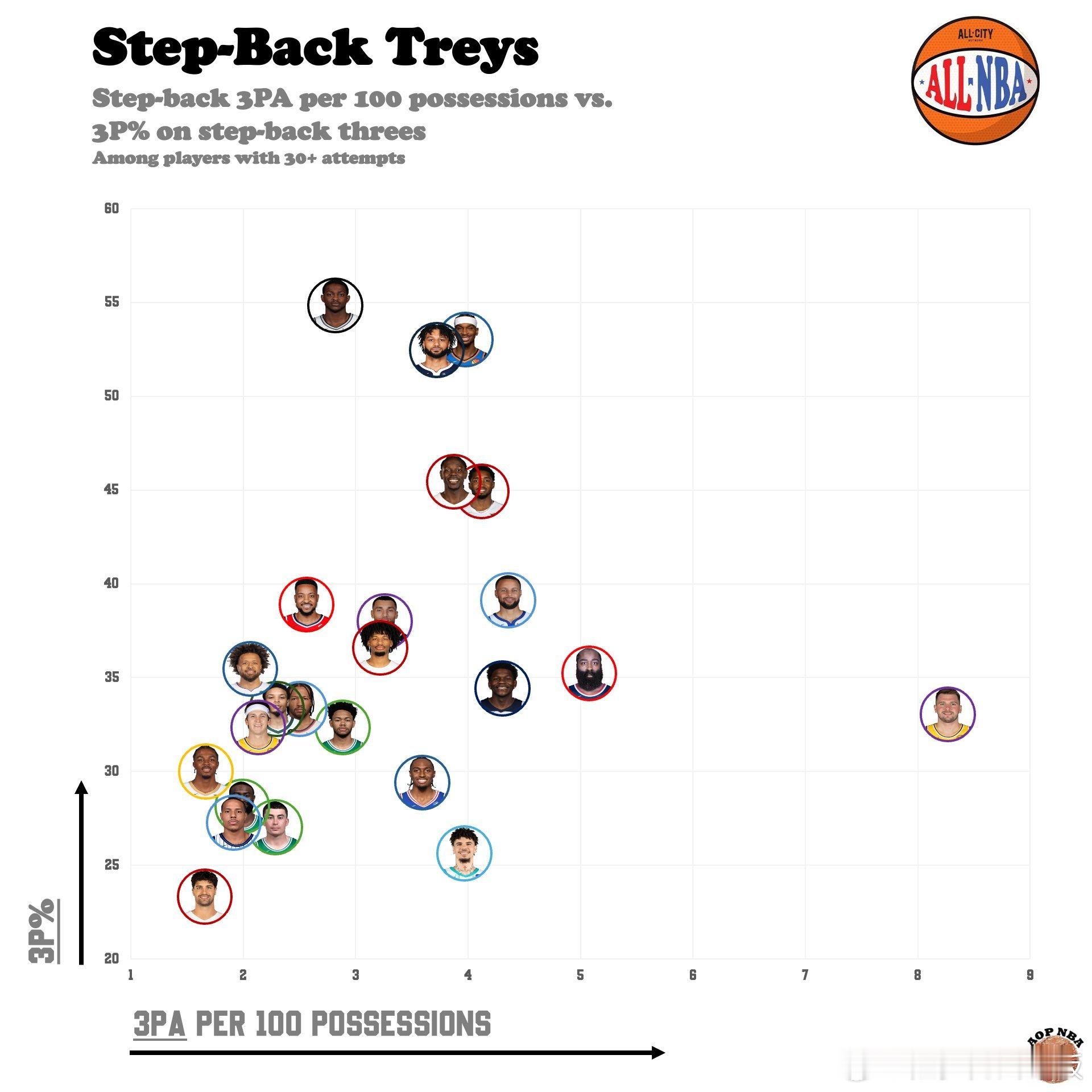 本赛季每100回合后撤步三分出手数和命中率情况👇(总出手数至少30次)-东契奇场均出手数最多,高产中效;-福克斯、穆雷和亚历山大后撤步三分命中率均超过50%🤯新赛季篮不住