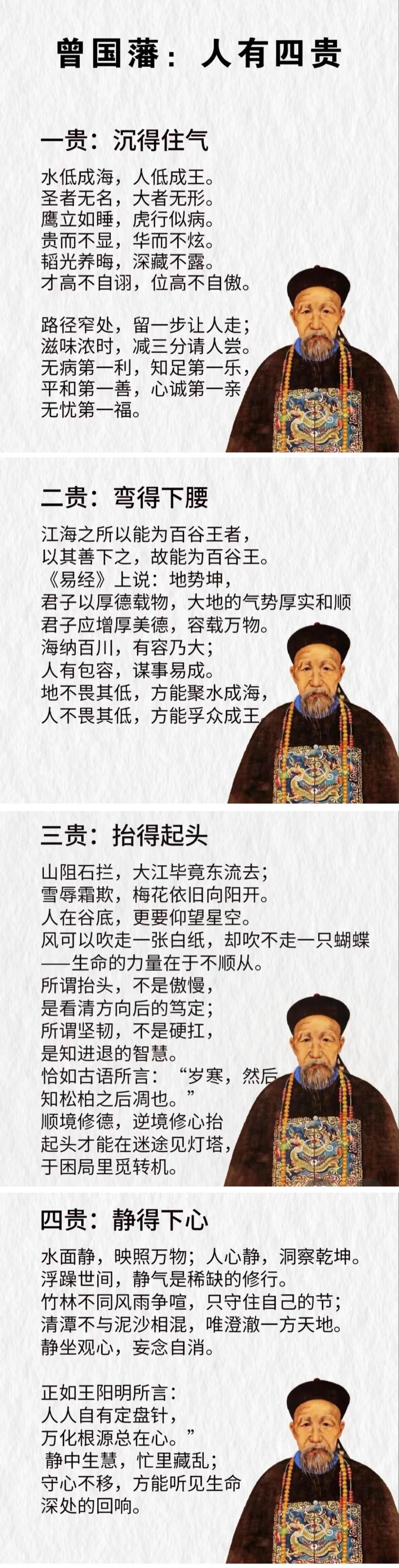 现代启示:为何四贵今日更珍贵? 在追逐即时满足的潮流中,沉得住气的耐性,与输得起的豁达,恰恰重塑着长期主义的价值根基。 弯得下腰的包容,可化社交中的浮躁与对立;抬得起头的坚韧,则能抵御“躺平”思潮下的消极与逃避。 曾国藩的智慧穿越时空,不仅为乱世指明存身之途,更在当代人修心立命的深处,提供了一种清醒而安稳的底层逻辑。