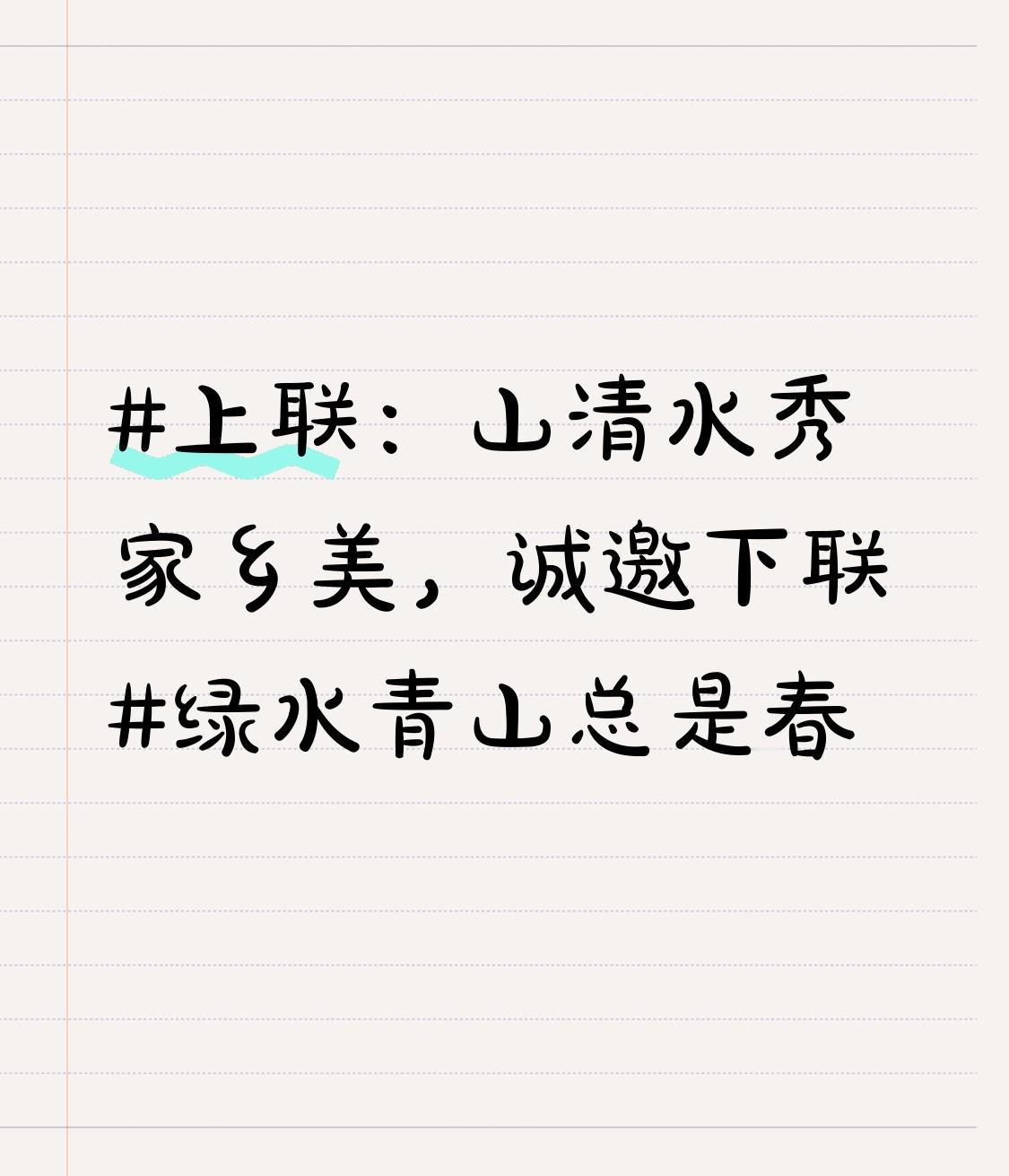 上联:山清水秀家乡美,诚邀下联绿水青山总是春