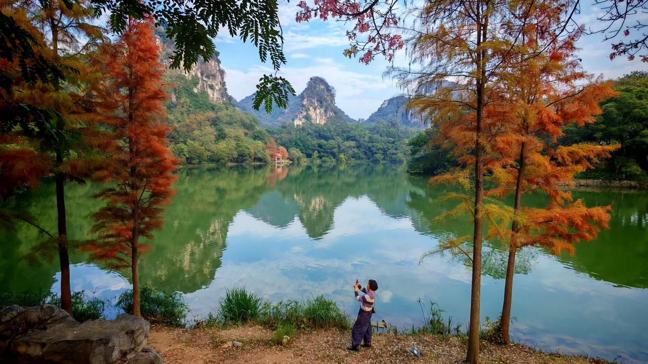 💚远山衔着云的软,秋水映着树的焰,人举起的镜头里,装着一整个季节的清欢。 ✨红杉点燃了秋的诗,湖水铺展着山的梦,人站在岸边,把天地的静谧与绚烂都收进掌心。