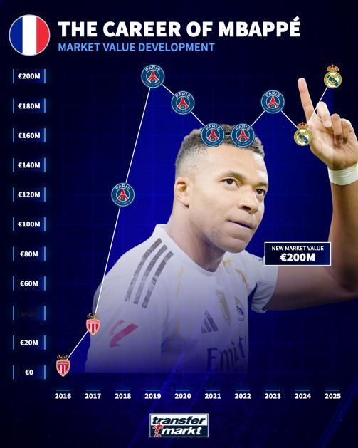 从天才少年到足坛第一巨星,这应该是姆巴佩职业生涯最真实的写照!上赛季他加盟了自己梦寐以求的俱乐部——皇家马德里,但他在伯纳乌的第一个赛季有点失望,尽管他个人打进了42个进球,但没有获得任何一座冠军奖杯,而他的老东家巴黎圣日耳曼获得了欧冠冠军!考虑到他的个人数据,有些对于他的批评有点过于严厉,本赛季他将自己提升到了另一个水平,他赢得了所有人的支持! 姆巴佩在2015年首次代表摩纳哥一线队出场,当时他只有16岁,这打破了亨利自1994年以来一直保持的为摩纳哥一线队出场的最年轻球员纪录!那年12月,他的第一个市场价值是5万欧元!这个数字在第二年4月增长到了100万欧元,但他真正在世界舞台上证明自己是在2016/17赛季,摩纳哥进入了欧冠半决赛,姆巴佩在9场比赛里打入6球,他的身价涨到3500万欧元,很快巴黎就伸来了橄榄枝! 巴黎以1.8亿欧元仅次于内马尔转会费的足坛历史第二贵的转会费签下了姆巴佩,之后他在巴黎不断的进球,身价也随之继续上涨。姆巴佩在巴黎的第一个赛季打入25球后,身价达到了1.5亿欧元!在接下来的比赛中,他的进球数字不断增加,身价也随之增加。在2018年做为法国队主力前锋获得世界杯冠军后,他的身价在12月份达到了历史最高的2亿欧元。这一数字在次年4月回落到了1.8亿欧元,一年后又下降到了1.6亿欧元! 去年夏天加盟皇家马德里后,姆巴佩的身价再次回到了1.8亿欧元。在经历了早期的挣扎和一些不切实际的期望后,他的身价在去年12月下降到了1.6亿欧元,但在上赛季结束后,他的身价又回到了1.8亿欧元!而现在姆巴佩又以2亿欧元的身价回到了世界之巅,对于姆巴佩来说,这是一段起伏不定的旅程,但有一件事始终如一:进球!