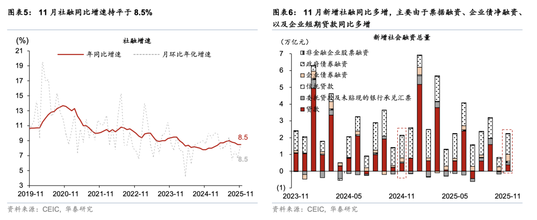 11月新增人民币贷款3,900亿元(彭博一致预期4,500亿元),同比少增1,900亿元;11月新增社融2.49万亿元(彭博一致预期2.2万亿元),同比多增1,597亿元。由此,11月社融同比增速持平于10月的8.5%,而季调后月环比折年增速较10月的6.7%回升至8.5%(图表5)。从社融分项看,票据融资、企业债净发行、企业短期贷款同比分别多增2,119、1,788、1,100亿元,是新增社融的主要支撑,而居民贷款、政府债净发行同比分别少增4,688、1,048亿元,对11月新增社融形成拖累(图表1,6)。