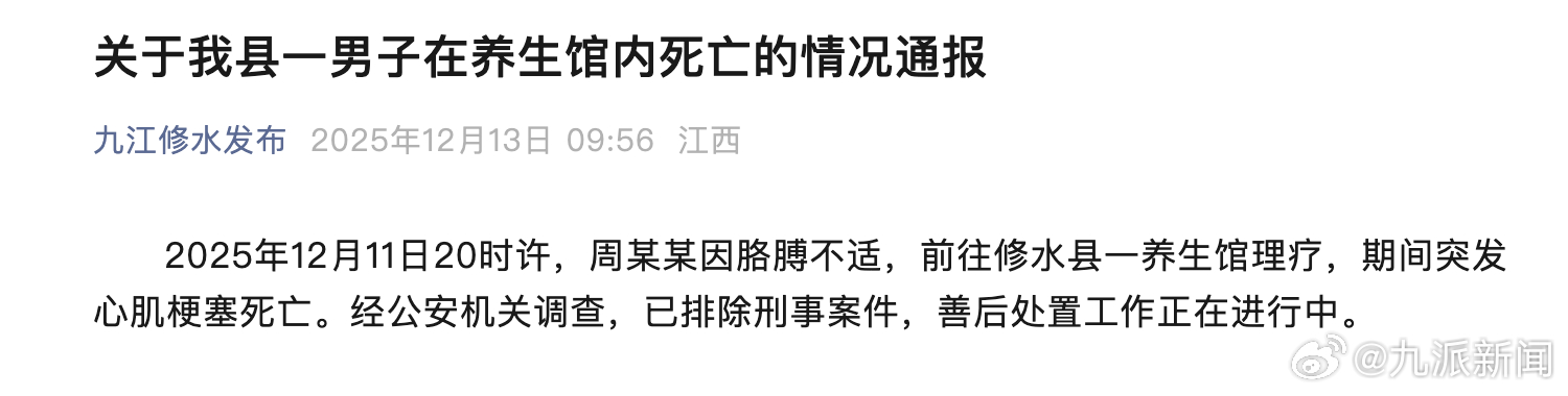 #男子养生馆内死亡排除刑事案件#【#官方通报男子在养生馆内死亡#】12月13日,据江西九江修水发布:2025年12月11日20时许,周某某因胳膊不适,前往修水县一养生馆理疗,期间突发心肌梗塞死亡。经公安机关调查,已排除刑事案件,善后处置工作正在进行中。此前,据媒体报道,12月11日晚,有网友在社交平台发布视频称,江西九江修水县一家养生馆内有人身亡。视频画面显示,一家招牌为某某“养生馆”的店门口聚集多人,并有警车停靠在侧。