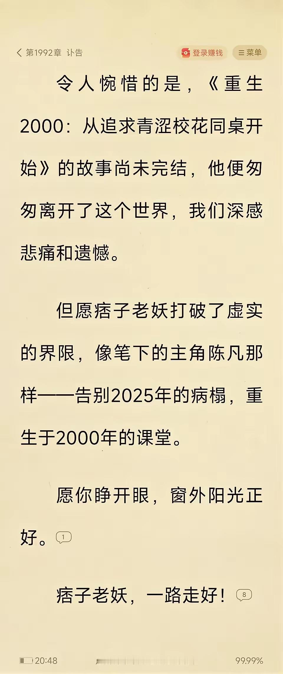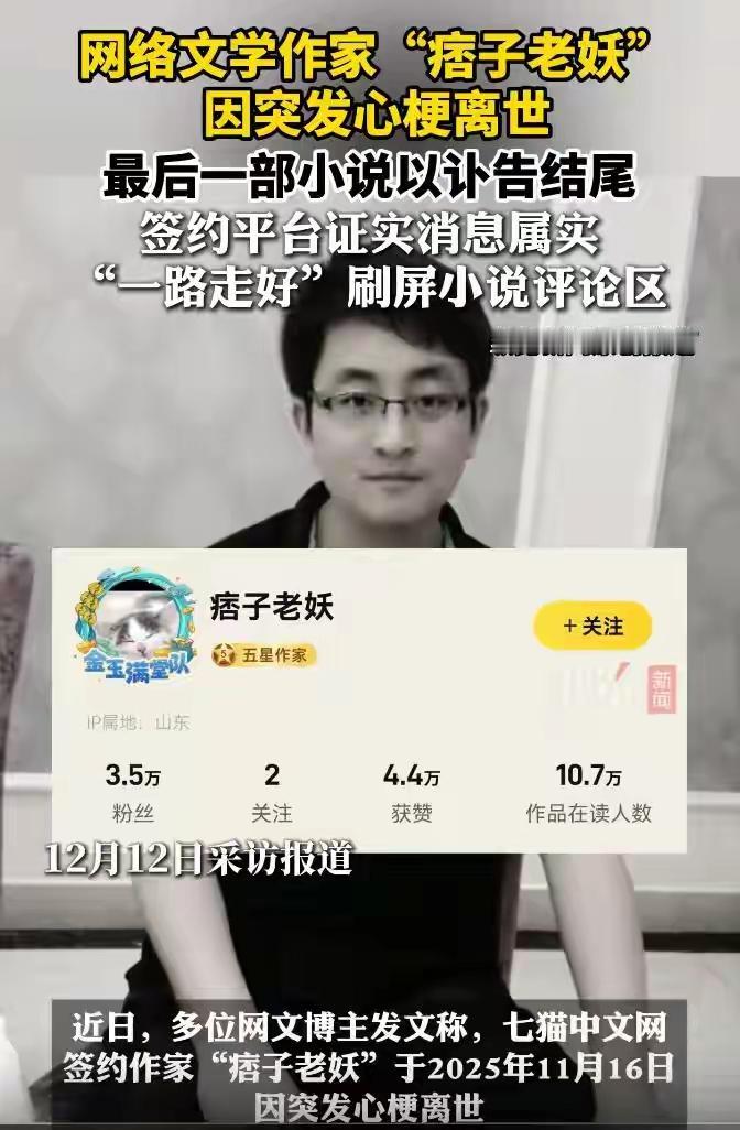 凌晨三点还在码字,三天写出半部《红楼梦》的长度——这不是“卷”,是“痞子老妖”的真实日常。 这位在七猫中文网写下630万字的作者,11月因心梗猝然离世,近一个月后,读者才从小说章节里读到他的讣告。更唏嘘的是,据传平台作者千字稿费常不足一元。 他笔下主角正构筑商业帝国,现实中的创作者却倒在了键盘前。如今读者自发续写故事,让主角也“心脏剧痛倒下”——这情节,比小说更让人鼻酸。 平台终于推出“强制休息令”,但这迟到的关怀,能挽回多少倒在追梦路上的“重生”? (网文这碗饭,真是用命在拌。)