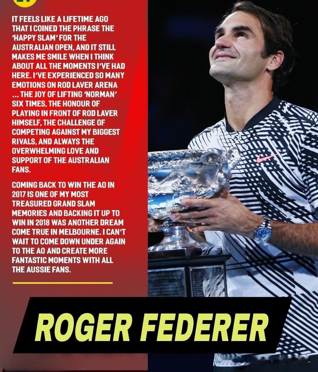 费德勒谈明年重返澳网赛场:“感觉我为澳网创造“快乐大满贯”这个说法已经是上辈子的事了,每当想起我在这里经历的一切,我仍然会微笑。在罗德拉沃球场,我体验过太多的情感:六次举起“诺曼奖杯”的喜悦,在罗德·拉沃本人面前比赛的荣幸,与我最大的对手竞争的挑战,以及澳大利亚球迷始终如一的、令我无比感动的爱与支持。””2017年重返澳网并夺冠是我最珍贵的大满贯回忆之一,而2018年成功卫冕,是墨尔本带给我的又一个美梦成真。我迫不及待地想再次来到澳大利亚参加澳网,与所有这里的球迷一起创造更多精彩瞬间。” 费德勒将于明年1月17日亮相澳大利亚网球公开赛开幕式,这位6次澳网冠军得主将与阿加西、拉夫特和休伊特联手奉献一场特别的“世界第一之战”表演赛。 网球 2026澳网