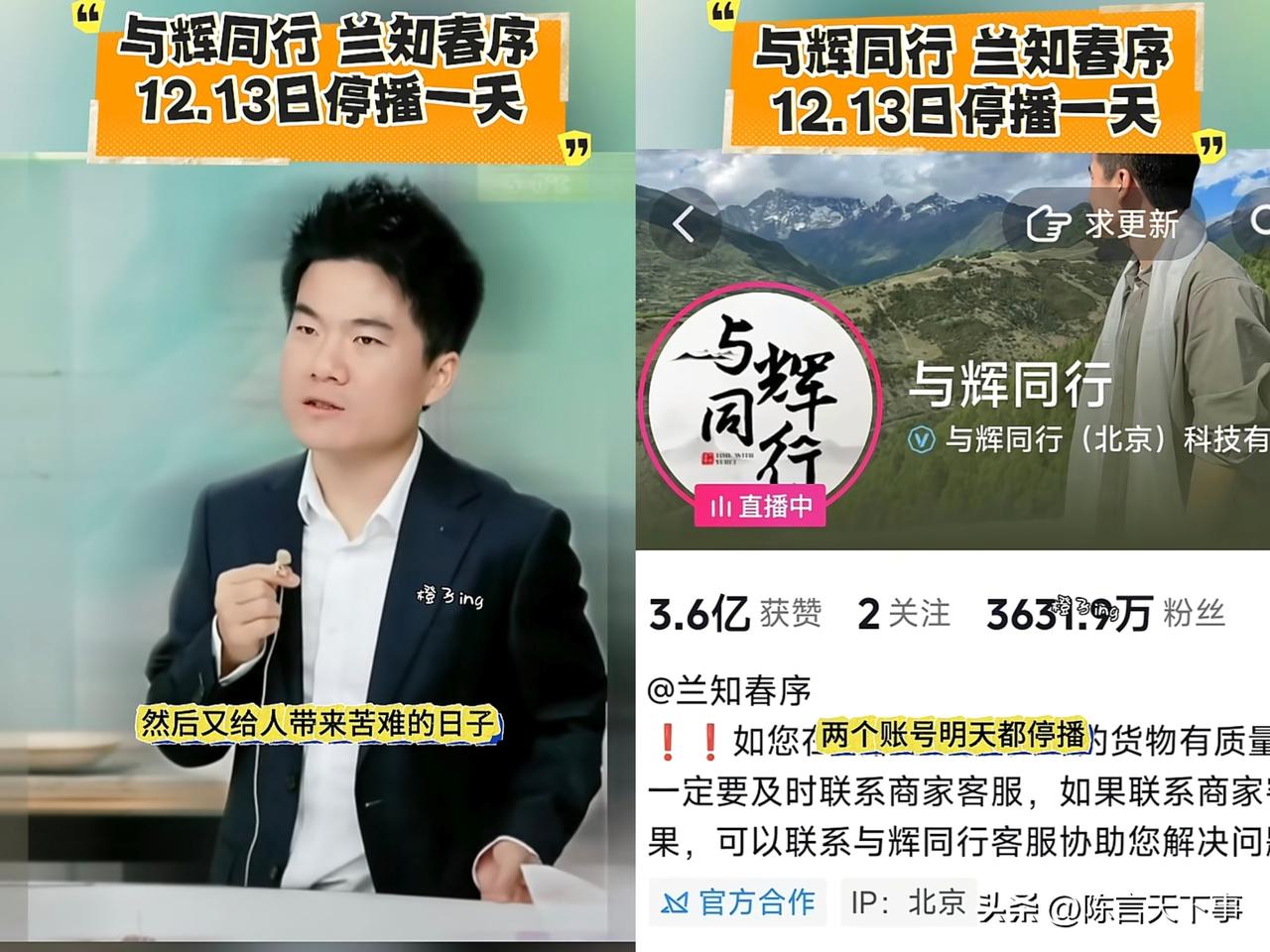 董宇辉要停播与辉同行和兰知春序了! 别误会,他只是不想在这个深刻且沉痛,又给人带来苦难的日子里直播卖货。 别看他们只是一个卖菜的公司,但他也想用这样的一个方式去表达对历史的一种铭记。 这是宇辉在直播间所说过的话,他怕网友会跑空失落,所以提前向你汇报了。 宇辉的责任心和国家情怀是毋容置疑的,他在民族大义方面一直都很重视的,这也是他为什么会被喜欢的原因吧!