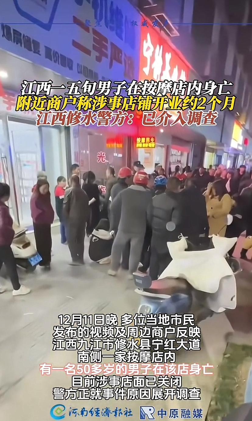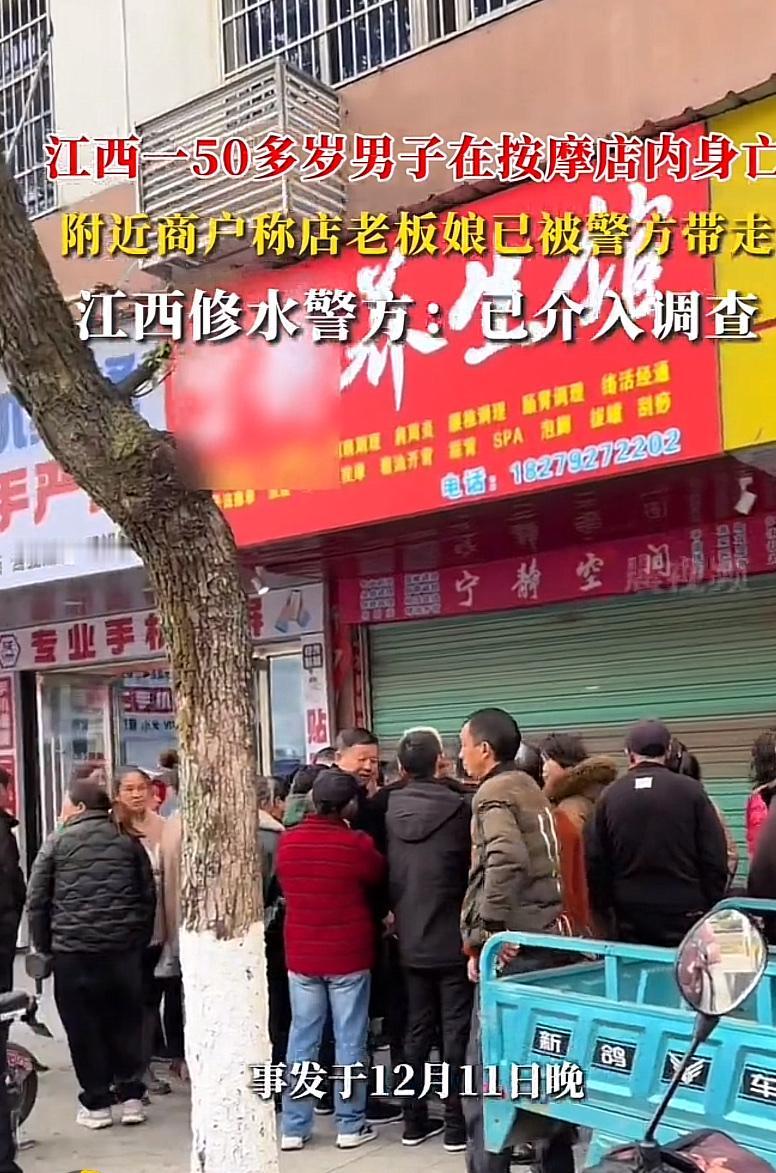 江西修水五旬男子按摩店内身亡,警方介入调查 2025年12月11日晚10时许,江西九江市修水县宁红大道南侧一家名为“**养生馆”的店铺内,一名50多岁的男子意外身亡,这一事件引发了当地市民的广泛关注。 据多位当地市民发布的视频显示,涉事店铺门头为红色,招牌上醒目地写着“养生馆”,主营业务包括按摩、采耳、SPA等,门头左侧还特意标有“正规”二字。然而,就是这样一家看似正规的养生馆,却发生了令人痛心的意外。视频发布者称,事发时间大约在当晚10点左右,现场聚集了不少人,还有警车停靠在侧,气氛显得格外凝重。 12月12日上午,记者尝试拨打该养生馆的电话,但电话那头始终是忙音,无法接通。随后,记者联系到了该养生馆附近的一家商户。据这位商户介绍,涉事的养生馆是私人经营的,开业仅仅约两个月时间,平时店内只有老板娘一人看店。11日晚,一名50多岁的男子进店进行按摩服务,到了晚10时许,意外突然发生,具体原因目前尚不明确。事发后,老板娘被派出所带走协助调查,店铺也一直处于关闭状态。 从周边商户的描述中可以得知,这家养生馆开业时间不长,平时的客流量和经营状况外界并不十分清楚。而此次事件的发生,无疑给这家新开不久的店铺蒙上了一层阴影。 记者从修水县警方处了解到,此事已由宁州派出所受理。目前,警方正在紧锣密鼓地对事件展开全面调查,详细经过以及男子的死因都还有待进一步确认。警方表示,会秉持公正、严谨的态度,不放过任何一个细节,尽快查明事件的真相,给死者家属和社会一个交代。 这起事件也引发了公众对于养生按摩行业安全问题的关注。近年来,随着人们生活水平的提高,养生保健意识逐渐增强,各类养生馆、按摩店如雨后春笋般涌现。然而,部分店铺存在着从业人员资质参差不齐、服务操作不规范等问题,给消费者的健康和安全带来了一定的隐患。此次江西修水的这起事件,再次为整个行业敲响了警钟。 在此,也提醒广大消费者,在选择养生按摩服务时,一定要选择正规、有资质的店铺,仔细查看从业人员的相关证书,确保自身的健康和安全。同时,也希望相关部门能够加强对养生按摩行业的监管力度,规范行业秩序,让消费者能够放心消费。 目前,这起事件仍在进一步调查中,我们将持续关注后续进展。江西修水50岁男子"养生馆"意外身亡