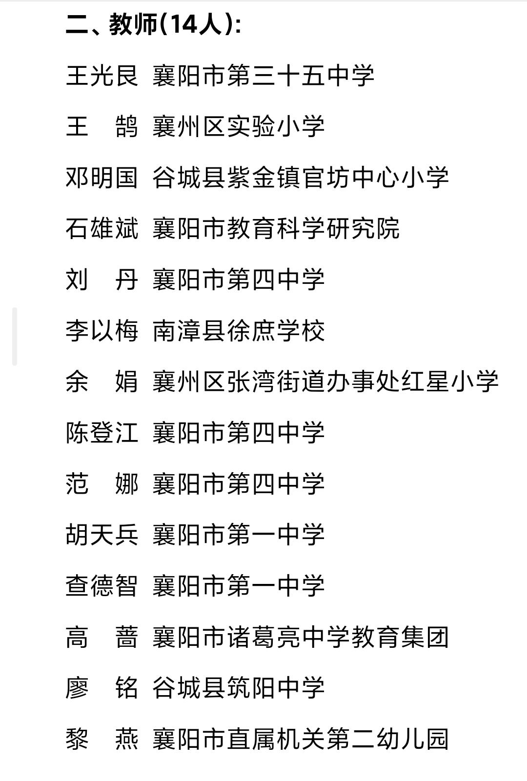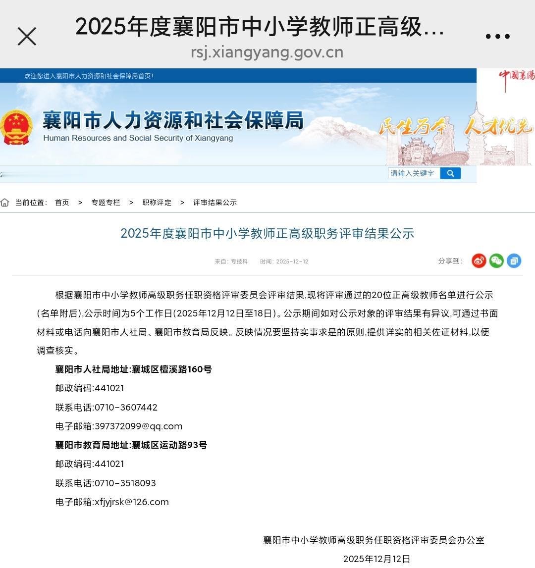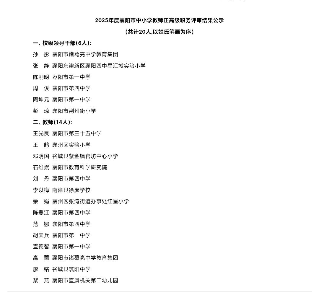 2025年度襄阳市中小学教师正高级职务评审结果(共计20人)