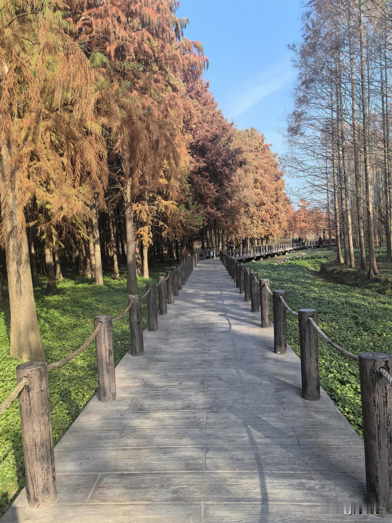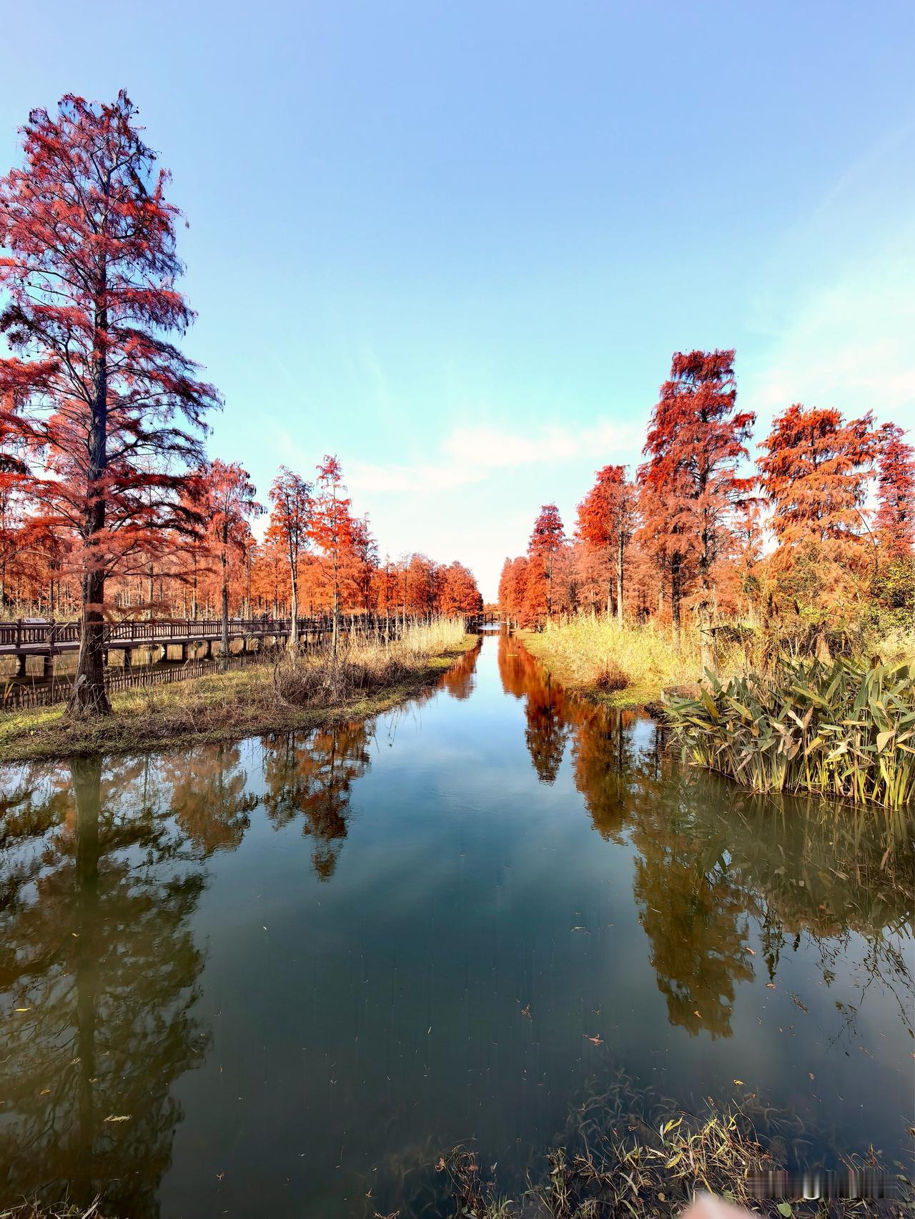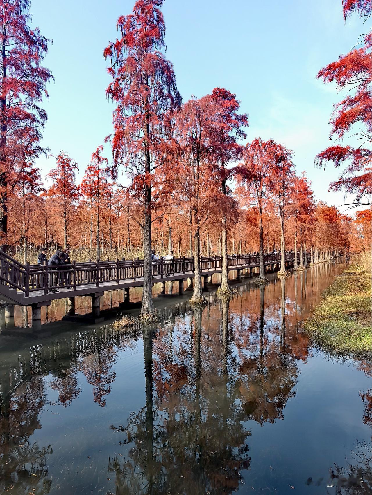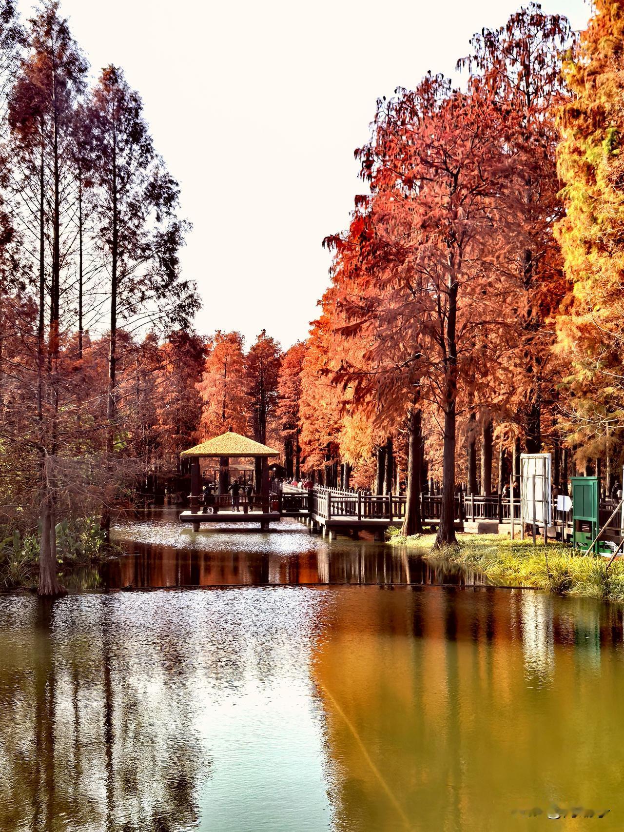上海,这个季节,最上镜的地方,青西郊野公园的水杉林绝对排得上号! 真的,你亲眼看到才会震撼——水面上立着一整片焦糖色、锈红色的水杉,水底下还沉着另一个完全对称的倒影,像把整个秋天都浸在了湖里。沿着木栈道慢慢走进去,就好像闯进了一个与世隔绝的安静星球。阳光好的时候,光线从高高的树干之间斜射下来,整片林子都在发光,那种颜色浓郁得就像油画调色盘。 耳边特别安静,只有风吹过树梢的沙沙声,和自己的脚步声。运气好的话,还能看见白鹭突然从水边飞起来,翅膀划破水面倒影,那一下心都会跟着静下来。森林公园水杉树 水杉公园 上海游园好去处 上海公园排行榜