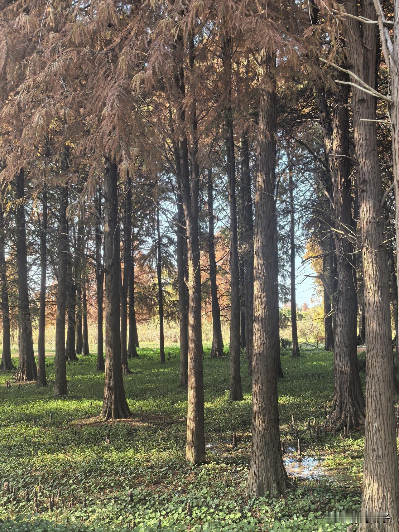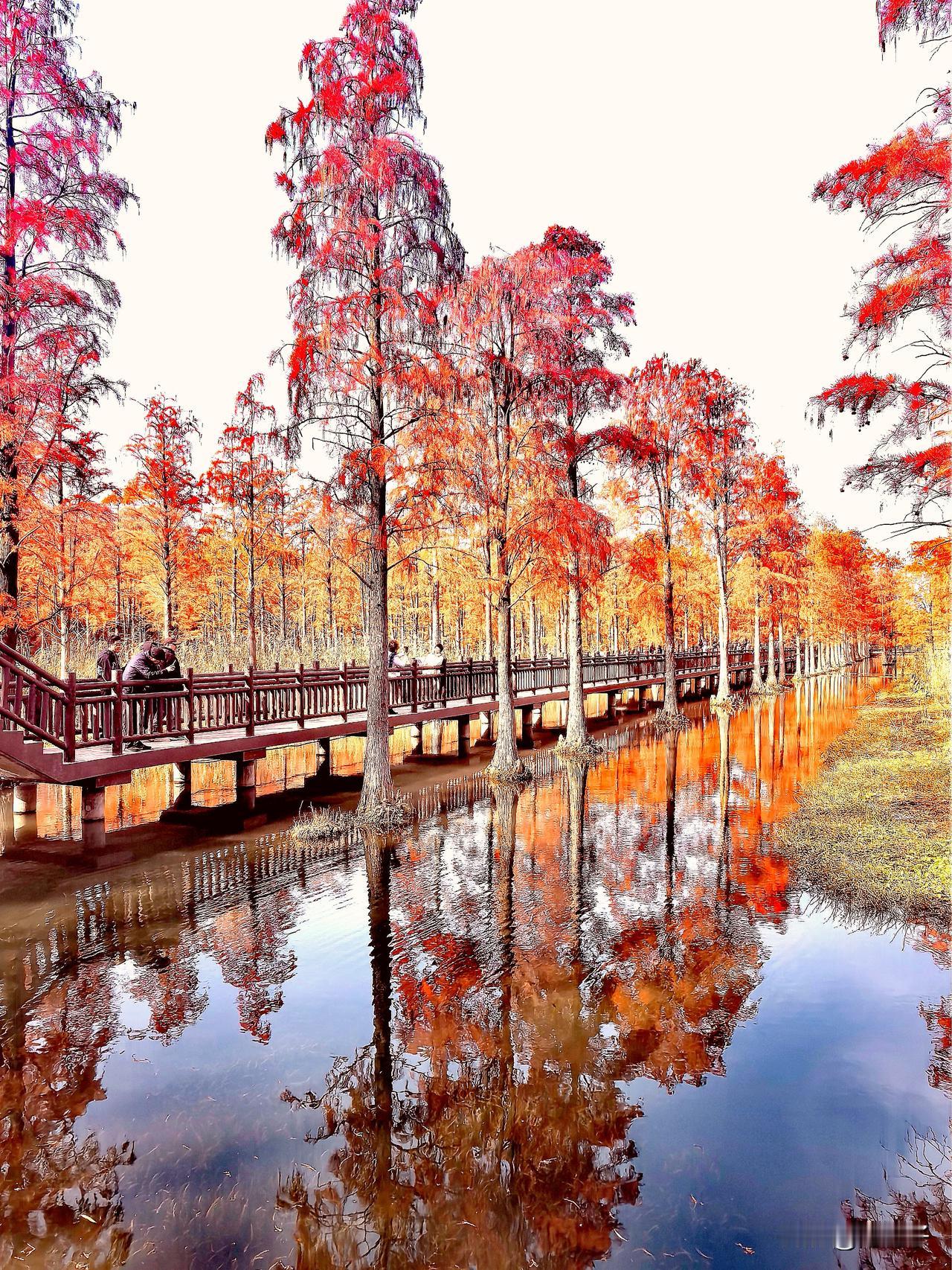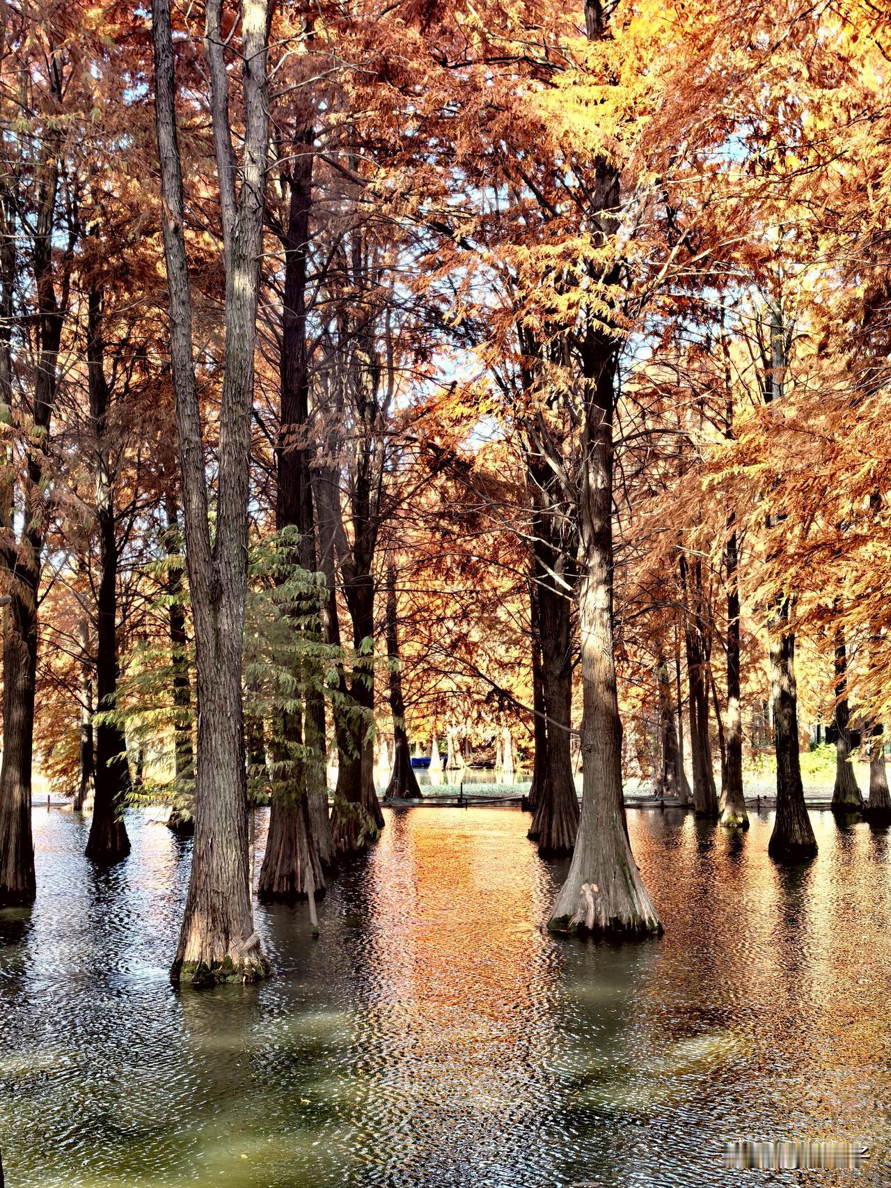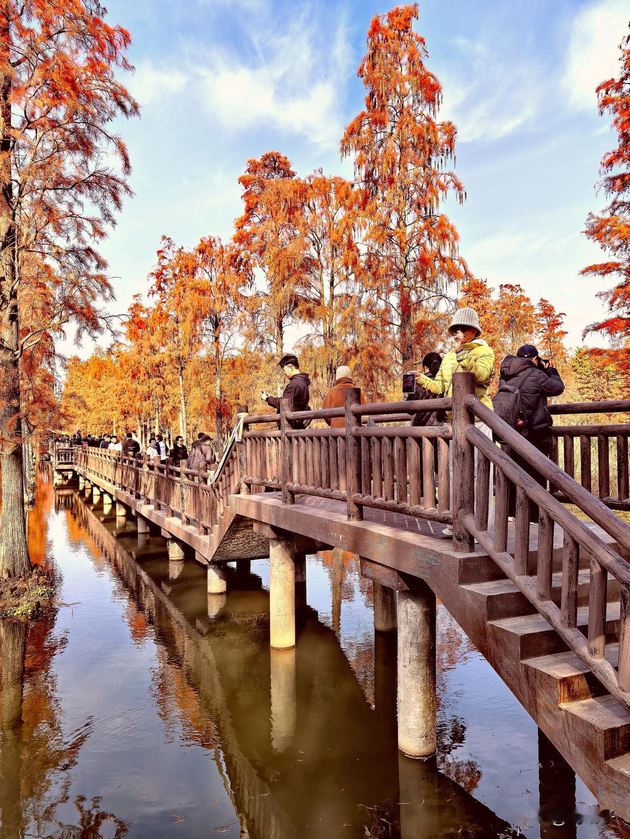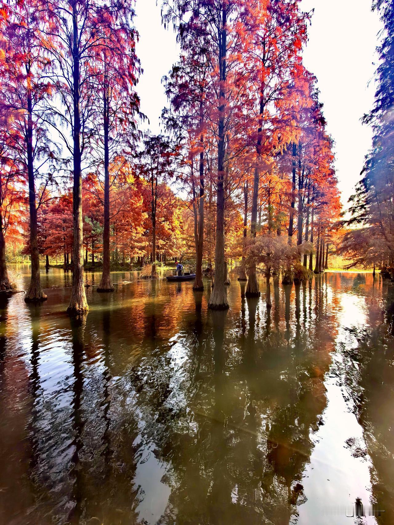 上海,这个季节,最上镜的地方,青西郊野公园的水杉林绝对排得上号! 真的,你亲眼看到才会震撼——水面上立着一整片焦糖色、锈红色的水杉,水底下还沉着另一个完全对称的倒影,像把整个秋天都浸在了湖里。沿着木栈道慢慢走进去,就好像闯进了一个与世隔绝的安静星球。阳光好的时候,光线从高高的树干之间斜射下来,整片林子都在发光,那种颜色浓郁得就像油画调色盘。 耳边特别安静,只有风吹过树梢的沙沙声,和自己的脚步声。运气好的话,还能看见白鹭突然从水边飞起来,翅膀划破水面倒影,那一下心都会跟着静下来。森林公园水杉树 水杉公园 上海游园好去处 上海公园排行榜