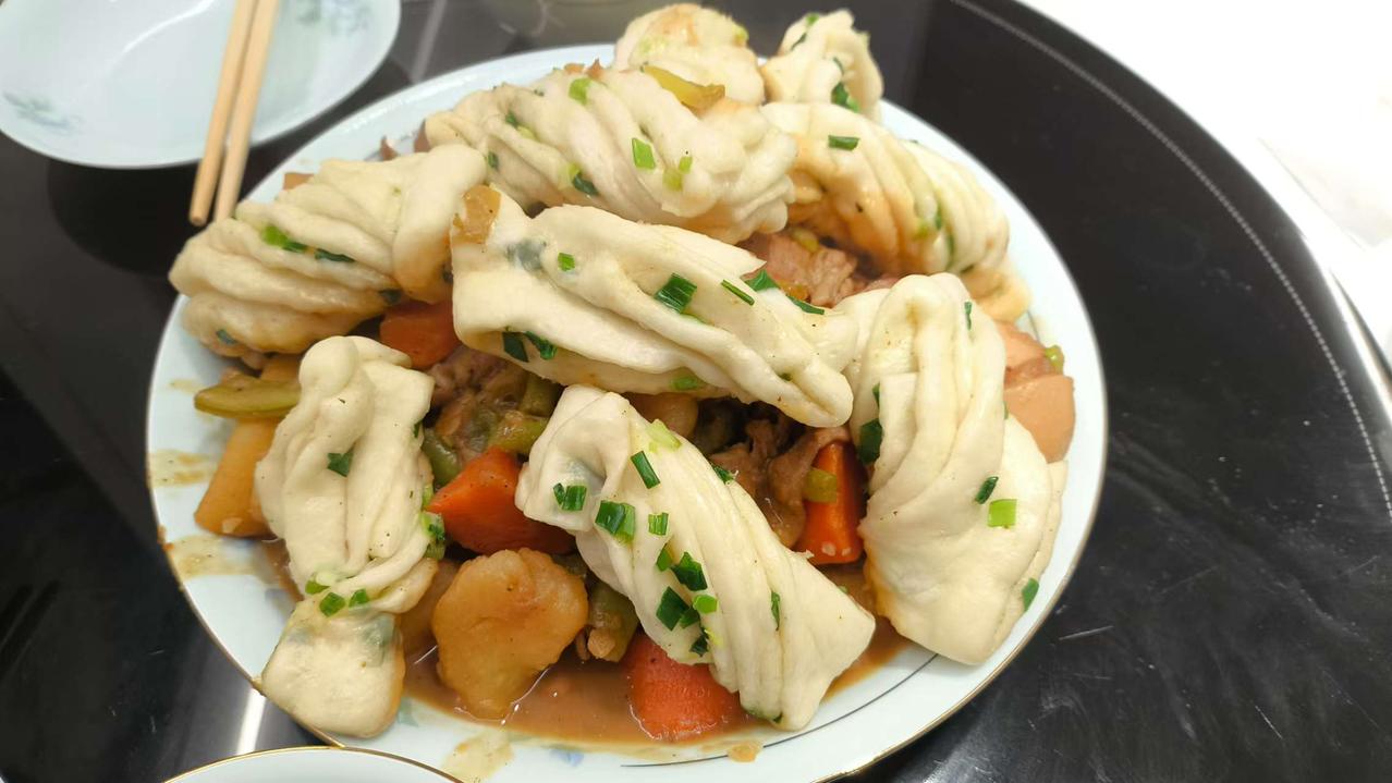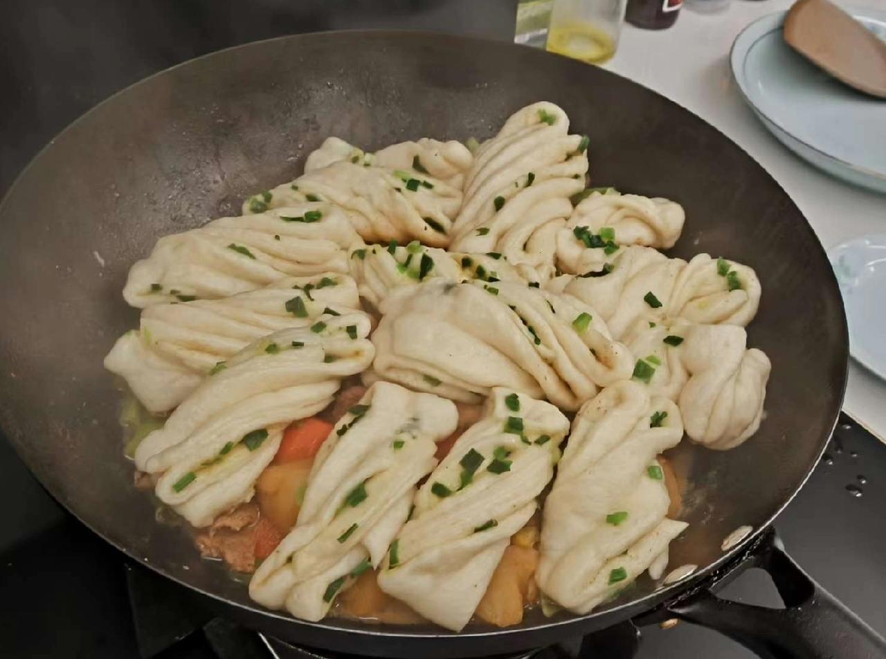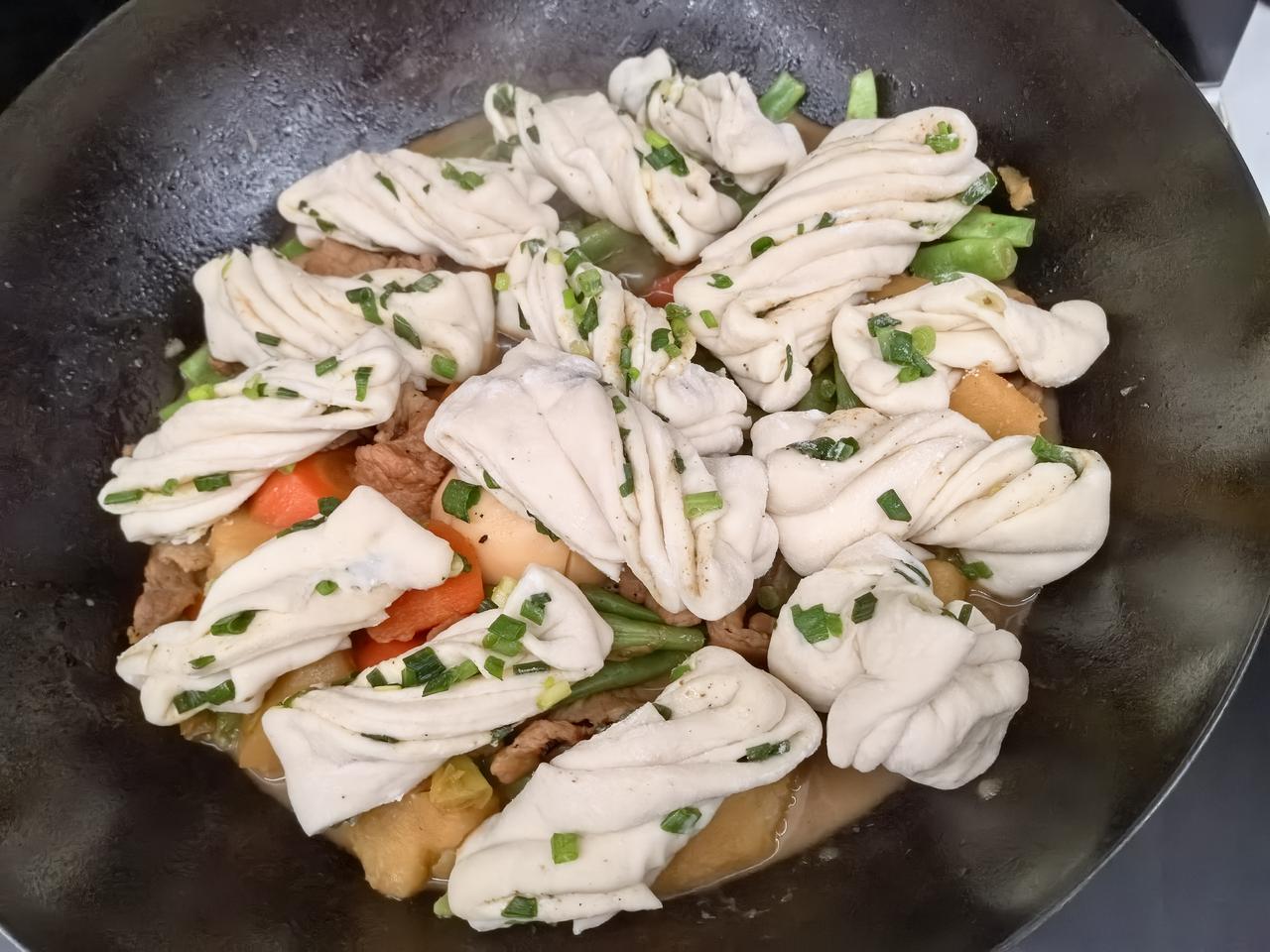 虽说在南方生活了很多年,但骨子里北方基因还是抹不去。 这不又想整点面食解解馋了,今天做一个花卷铁锅炖。 一早起来就忙乎起来,买了五花肉,土豆,胡萝卜和豆角,肉用酱油和五香粉腌上,其他备菜洗净切好。 准备300克高筋面粉,3克酵母粉,160毫升温水,和面发面。 一小时后面发起来了,擀成椭圆型薄片,上面涂点油撒点葱花,叠起来,切成条状,两条叠起来卷成麻花样,放着二次醒发。 这时开始炒五花肉,加上生抽,料酒,黄酱,再把土豆,胡萝卜和豆角放进去,加上开水一起炖半小时后放入花卷,十五分钟开锅,一大锅喷香的铁锅炖一锅出了。 窗外寒风凛冽,屋内热气腾腾,这一锅两人全吃完了,可见有多好吃。