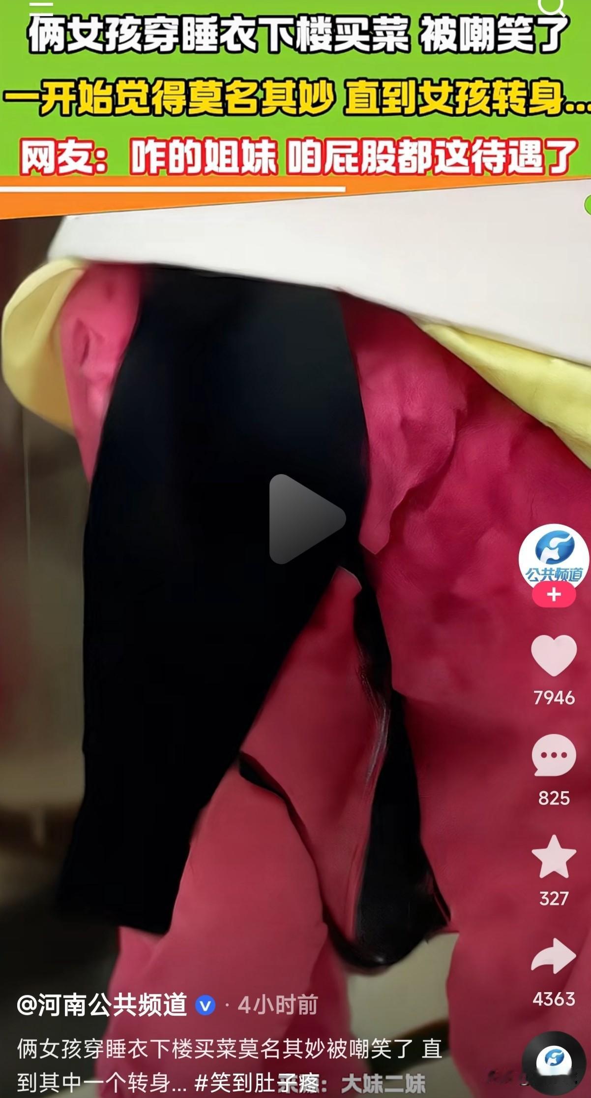 俩女生穿着睡衣睡裤下楼买菜被嘲笑,一开始觉得莫名其妙的被人嘲笑以为自己穿的衣服不合适,没想到转身后发现屁股竟然也有胸的待遇了。 路人嘲笑总有人家嘲笑的理由,眼睛长在前面只能看到前身,当然后面肯定是看不到的,谁能想到她屁股上居然挂着一件内衣,这是着急忙慌的出门没有整理衣服吗?还是她同伴故意给她挂在屁股上面的?这路人不嘲笑她们该嘲笑谁呢?幸亏是卖菜的阿姨提醒她们的,这要是个男的提醒她们,会不会被说成是流氓行为了?这种情况是不是只能女性同胞给提个醒?如果男同胞提醒是不是就成另一回事了?就是不被骂流氓也会被骂变态是不是?