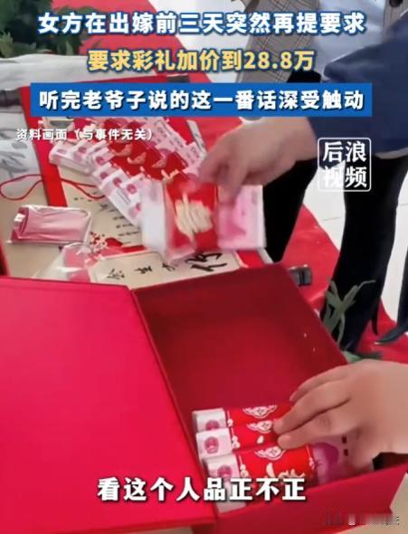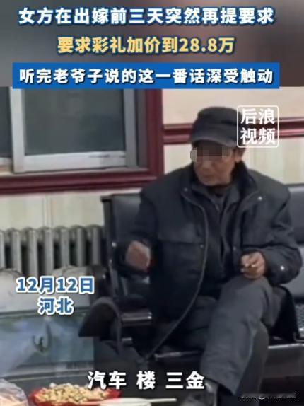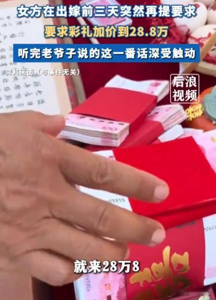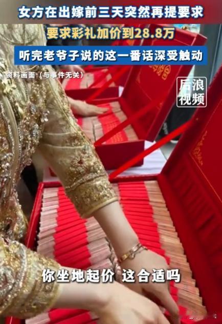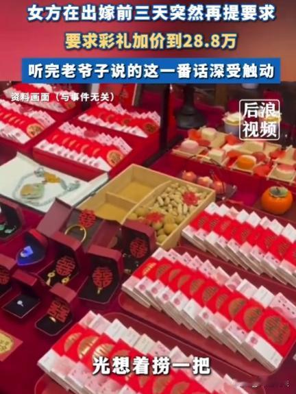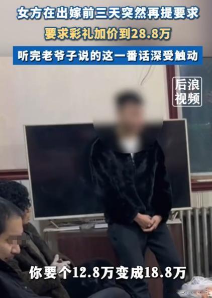 河北,一男子3天后就要办喜事,女方却临时加10万彩礼,这并非女方首次加价,订婚时,女方要汽车、房子、3金和12.8万彩礼,男方答应,不久彩礼加到18.8万,男方也同意了,定好结婚日且通知亲友后,婚礼前3天女方又把彩礼加到28.8万,不加就不结婚,男子犹豫,家里长辈一番话让他清醒,长辈究竟说了什么! (信息来源:后浪视频、河南乡村频道) 一男子和对象恋爱时,男方礼数周全。 订婚时,女方提出要房、车、3金和12.8万彩礼,男方一口答应,订婚顺利完成。 男子家里就是普通家庭,父母辛苦一辈子攒了点钱,就盼着儿子能成家立业。 男子对女方也是真心实意,恋爱期间那是关怀备至,女方提啥要求,只要不过分,男方都尽量满足。 订婚的时候,女方提出要房要车,还得有3金和12.8万彩礼,男子想着结婚是人生大事,最终也答应了。 可谁能想到,订婚没多久,女方就变卦了,要求彩礼加到18.8万。 男子家里一听就懵了,这刚订婚就加价,心里虽然不乐意,但怕悔婚了,之前花的钱都打了水漂,而且儿子年纪也不小了,再找对象也不容易,思来想去,还是同意了。 男子赶紧定下婚期,开始紧锣密鼓地准备结婚的事,酒席订好了,婚房也布置好了,亲戚朋友都通知了个遍,就等着喜事临门了。 可离喜事还有3天的时候,女方又出幺蛾子了,要求彩礼加到28.8万,还说要是拿不出来,这婚就不结了。 男子,这下受不了,这哪是结婚,简直就是敲诈勒索。 男子父母一辈子的积蓄,再加上借的钱,才勉强凑够了18.8万彩礼,这又让加10万,上哪弄去。 男子心里也憋屈,自己真心实意对待女方,没想到女方这么不讲理,一次又一次地加价,这婚要是结了,以后还不知道会怎么样。 男子心里犹豫不决,不知道该怎么办才好。 这时,家族长辈知道了这事,都聚在一起商量对策。 有的长辈说,这女方太过分了,根本就不是真心想结婚,就是冲着钱来的,这婚不能结。 也有的长辈说,都准备到这份上了,要是退婚,损失太大了,再跟女方商量商量,看看能不能少加点。 就在男子犹豫的时候,家族里一位德高望重的长辈站了出来,对男方说:【孩子,婚姻是一辈子的大事,不能只看物质。 这女方一次又一次地加彩礼,还以不结婚要挟,这说明她人品有问题,三观不正。 就算你现在凑够了钱,勉强结了婚,以后的日子也过不好,你要好好考量考量,别因为一时的面子和损失,耽误了自己一辈子的幸福。】 男子听了长辈的话,如梦初醒,仔细想了想,觉得长辈说得太对了。 这女方根本就不是真心想和他过日子,就是把他当成了提款机,要是这次妥协了,以后还不知道会有多少麻烦事。 于是,男子下定决心,决定退婚。 这事,男子退婚虽无奈,但及时止损也明智,婚姻不能只靠物质维系。 女方多次加彩礼的行为,到底有没有触犯法律呢? 女方这种订婚定好彩礼,婚前多次加价还以不结婚要挟的行为,很可能构成借婚姻索取财物。 根据《民法典》婚姻家庭编的解释规定,当事人请求返还按照习俗给付的彩礼的,如果查明属于以下情形,应当予以支持:双方未办理结婚登记手续;双方办理结婚登记手续但确未共同生活;婚前给付并导致给付人生活困难。 男方因为女方的多次加价,已经承受了巨大的经济压力,如果因为彩礼问题最终没结婚,或者婚后生活困难,男方完全可以依据上述规定,要求女方返还彩礼。 恋爱期间,男方赠给女方的节日礼物等消费性支出,属于彩礼吗? 这些消费性支出,不属于彩礼的范畴。 因为彩礼通常是以结婚为目的,按照当地习俗给付的较大数额的财物。 而节日礼物等消费性支出,更多是一种情感表达和日常交往的体现,不具有彩礼的性质,所以无法返还。 有些地方,彩礼习俗变了味,成了攀比和敛财的工具。 一些人把婚姻当成了买卖,只看重物质条件,忽视了感情基础和人品修养。 这种不良风气,不仅给很多家庭带来了沉重的经济负担,也破坏了公序良俗。 婚姻是建立在爱情和相互理解的基础上的,不是用金钱来衡量的。 在选择伴侣的时候,要注重对方的人品和三观,而不是只看物质条件。 最终,男方决定退婚,虽然损失了一些钱财,但也避免了未来可能出现的更多麻烦。 在面对婚姻问题时,要保持清醒的头脑,不要被物质冲昏了头脑。 婚姻是人生中最重要的事情之一,不能被金钱和物质所左右。 要树立正确的价值观,追求真挚的感情和幸福的婚姻。 希望每一个人都能在婚姻的道路上,找到那个真正与自己携手一生的人。