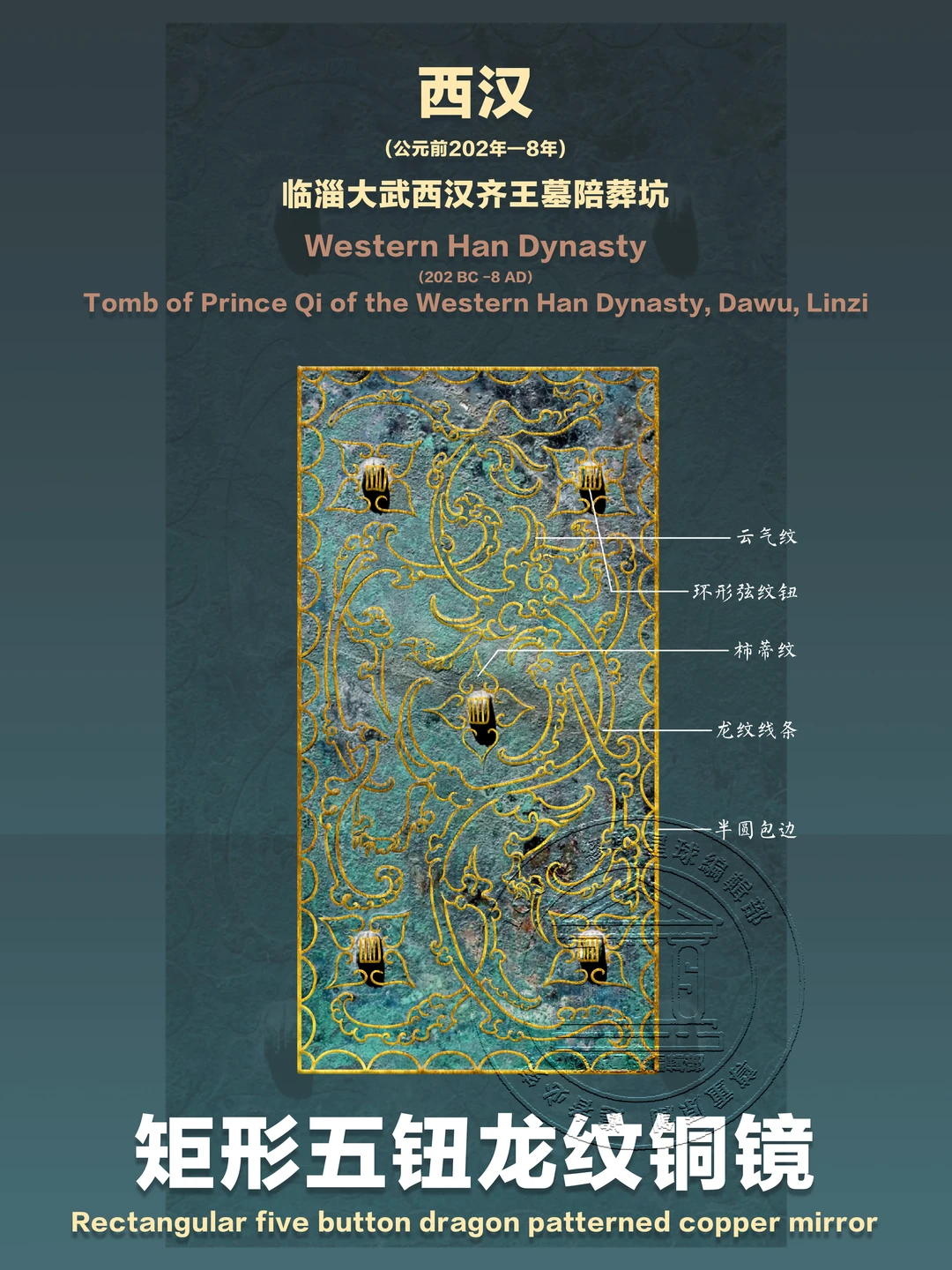 📍西汉矩形五钮龙纹铜镜,它颠覆了千年圆镜传统,铜镜厚度仅1.2厘米(对比现代手机厚度),而它也凭借“有棱有角”的矩形身材脱颖而出,以 115厘米的身高(115.1×57.5cm)、56.5公斤体重,登顶『中华第一铜镜』!