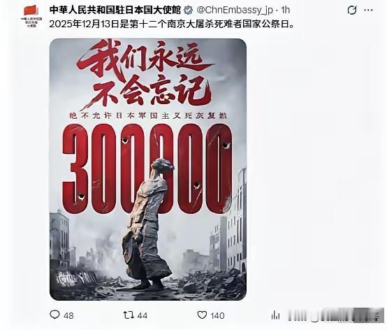 这次我们一个日本字都没写!中国驻日大使馆今天(12月13日)发文写道:2025年12月13日是第十二个南京大屠杀死难者国家公祭日,并附图,图中,巨大的红色 “300000” 字样让人醒目。 红色的300000不是冰冷数字,是三十万同胞的冤魂,是中华民族永远的伤痛。每一笔都浸着鲜血,每一字都刻着屈辱,提醒着我们那段暗无天日的岁月。 1937年12月13日,侵华日军铁蹄踏破南京城,一场长达六周的人间浩劫就此开始。手无寸铁的百姓惨遭屠戮,城市沦为废墟,哀嚎声穿透寒冬,成为民族记忆里最痛的烙印。 短短六周时间,2万多起强奸暴行接连发生,三分之一的建筑被烧毁,无数财物被肆意掠夺。日军的残暴突破人性底线,每一个罪行都铁证如山,不容任何篡改和否认。 2014年2月27日,全国人大常委会全票通过决定,将12月13日设立为国家公祭日,以立法形式铭记历史。每年这一天,南京都会下半旗致哀,防空警报响彻全城,告慰遇难同胞。 如今登记在册的南京大屠杀幸存者仅剩24人,平均年龄95岁。他们带着满身伤痕,数十年如一日讲述历史真相,用余生捍卫那段不容遗忘的苦难记忆。 96岁的幸存者夏淑琴,当年全家七口遇害五人,自己身中三刀侥幸存活。为驳斥日本右翼污蔑,她跨国诉讼九年,最终胜诉,用法律捍卫了历史真相。 国际友人曾是黑暗中的微光,约翰·拉贝收留600多名难民,约翰·马吉冒死拍摄日军暴行影像。这些珍贵史料成为铁证,让全世界看清侵略者的狰狞面目。 张纯如以生命为代价,撰写《被遗忘的浩劫》,让南京大屠杀真相传遍世界。她在书中疾呼,正视历史才能斩断仇恨,纵容谎言就是重蹈覆辙。 可日本右翼势力从未停止翻案行径,修改教科书模糊侵略史实,政要执意参拜靖国神社甲级战犯,公然挑战人类良知和战后国际秩序。 今年是抗战胜利80周年,中华民族早已不是当年任人欺凌的模样。国家强大才有底气捍卫历史,才有能力守护和平,这是三十万冤魂用生命换来的启示。 外交部明确表态,绝不允许日本右翼开历史倒车,绝不允许军国主义死灰复燃。任何美化侵略、否认罪行的行径,都必将遭到中国人民和世界正义力量的坚决反对。 驻日大使馆零日语发文,红色300000是最有力的控诉,更是最坚定的立场。不用多余言辞,历史真相早已镌刻在民族血脉里,永世难忘。 铭记苦难从不是为了延续仇恨,而是为了守护和平不再流失。唯有牢记先辈牺牲,砥砺前行,才能告慰逝去的同胞,让和平之花永远绽放。 今天,我们以国之名祭奠逝者,以史为鉴警示未来。每一个中国人都该铭记:落后就要挨打,自强才能安邦,民族复兴的征程上,我们步履不停。 三十万冤魂昭昭,历史真相铮铮。无论时光过去多久,这段伤痛都不能淡化,这份记忆都必须传承,这是对逝者的告慰,更是对民族的负责。 各位读者你们怎么看?欢迎在评论区讨论。