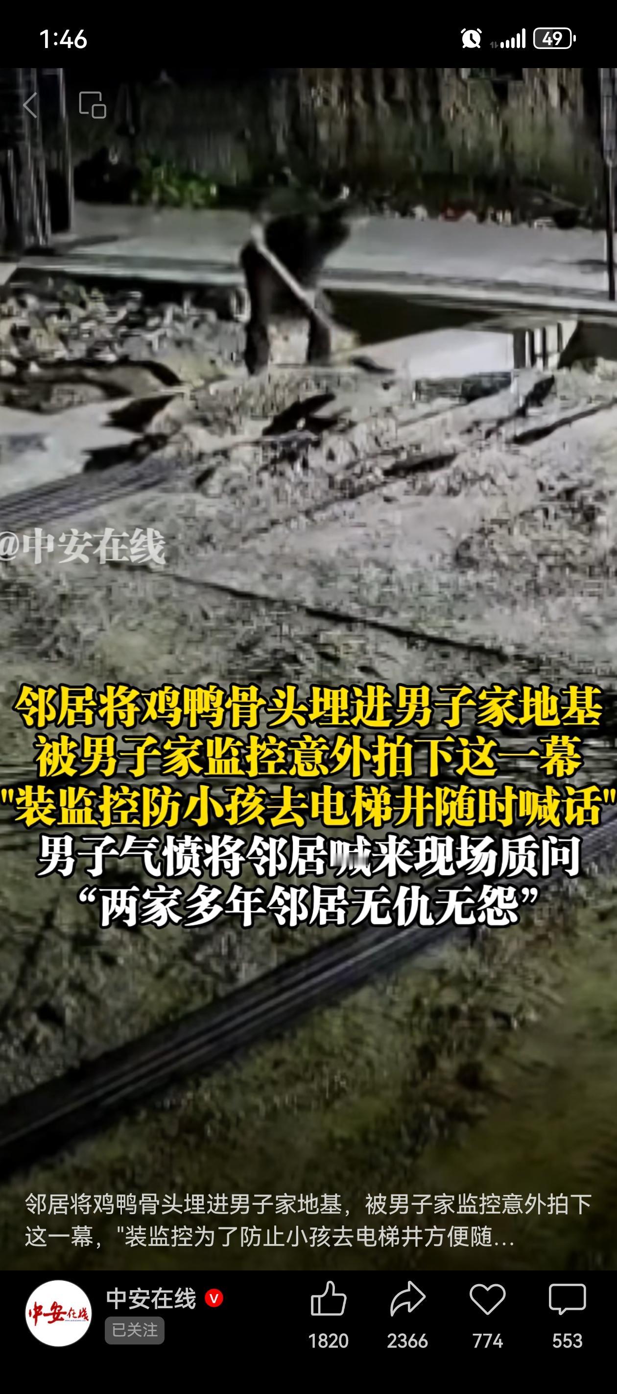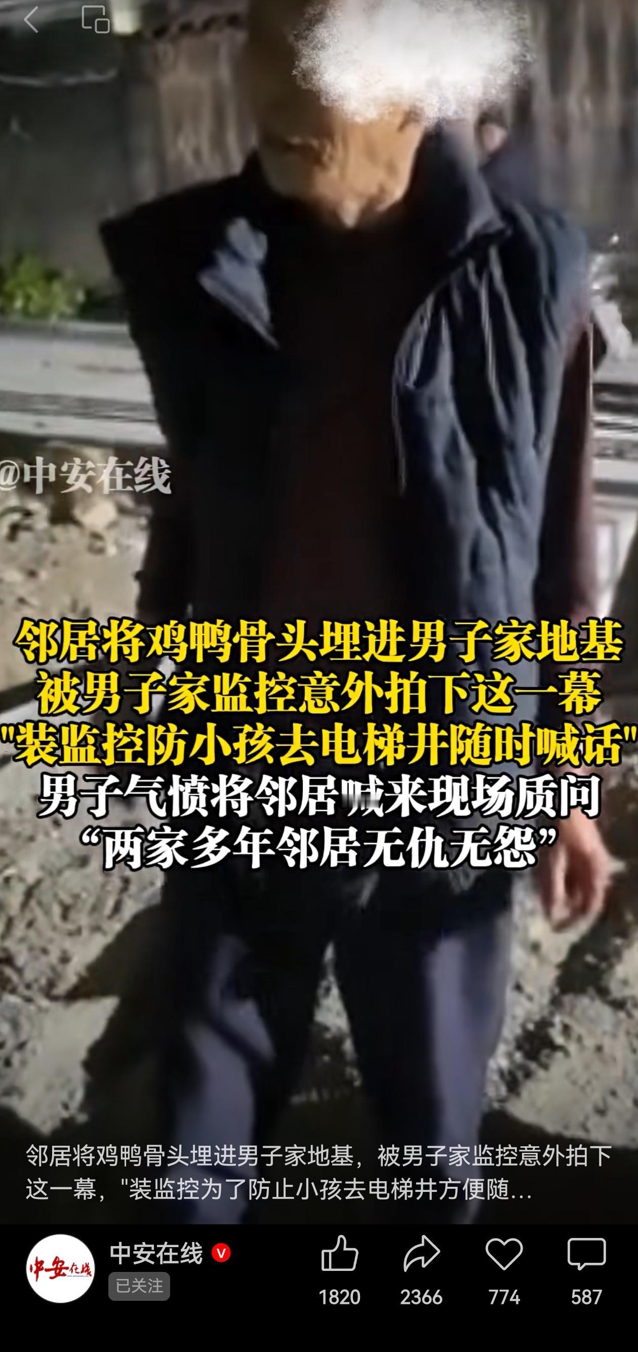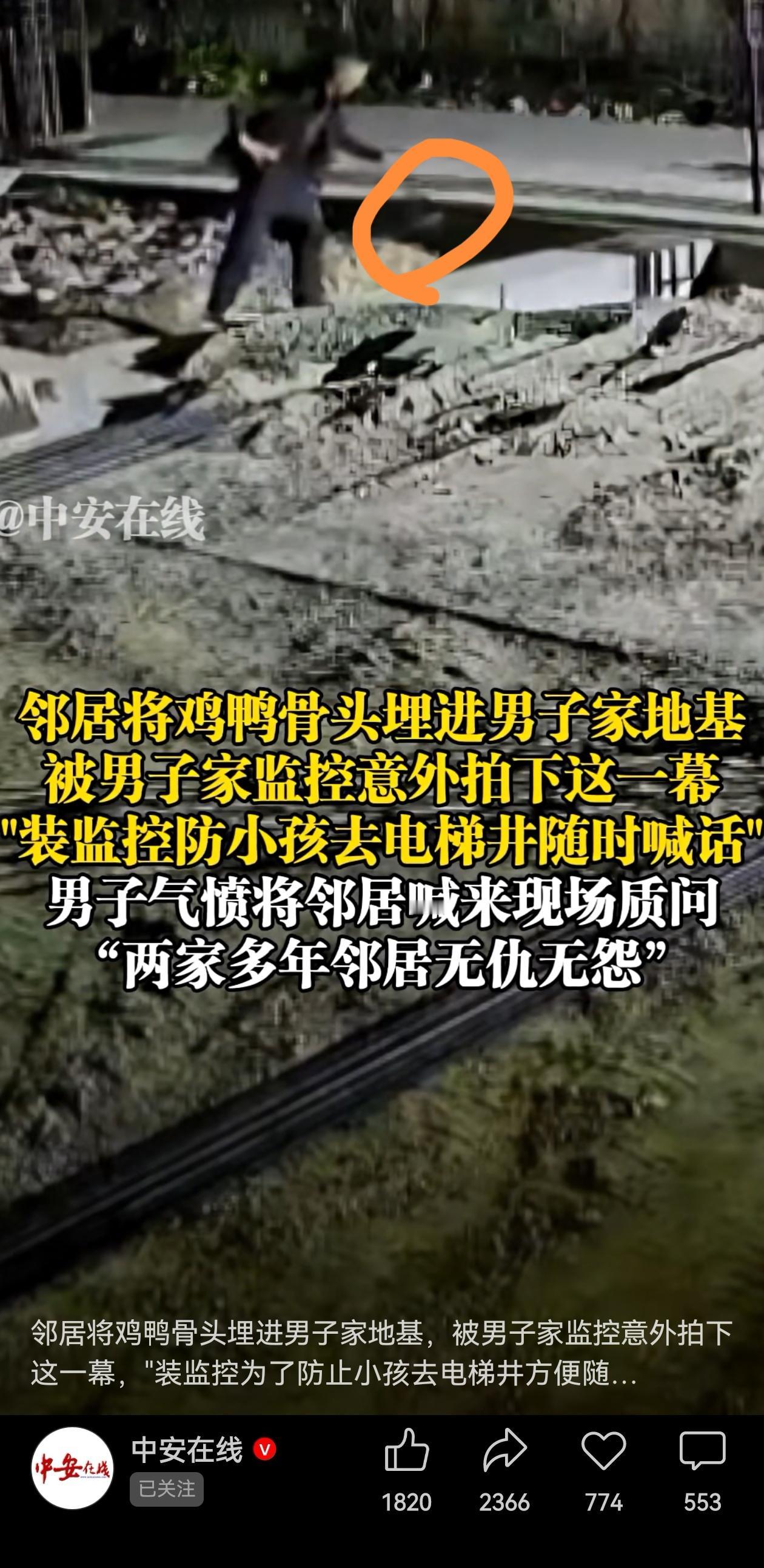 这操作,纯坏!12月12日,广东一户人家,高高兴兴建新房,却在地基内发现死鸡鸭,还用沙土掩盖起。 幸亏这家为了孩子安全安装了监控,而这一幕恰好被监控拍得清清楚楚,丢死鸡鸭的竟是自己相处多年邻居! 往人家地基、墙角埋动物骨头,特别是死鸡死鸭这种,无非就是故意要坏人家的风水气运,咒人家倒霉、破财、家宅不宁。 这户人家也没弄明白,还以为是多年的邻居,无冤无仇。而这位邻居自己觉得神不知鬼不觉,做得隐蔽,弄些鸡鸭骨头,还大晚上偷偷摸摸埋进去,一气折腾。 真是一言难尽啊!结果除了给人家心里添个大堵,给自己结个死仇,得到了啥? 邻居心里有不平,但是解决邻里矛盾用错了方法,走了反路。选择了阴损的诅咒手段,去主动制造矛盾和晦气。 他以为破坏的是别人家的风水,实际上,他首先彻底破坏了两家之间的“和气”,这相当于自己亲手自家这块福地,变成了一个是非坑。 “远亲不如近邻”,一个好邻居,难道不是最好的福气?不是真正的“好风水”吗? 信息来源:中安在线