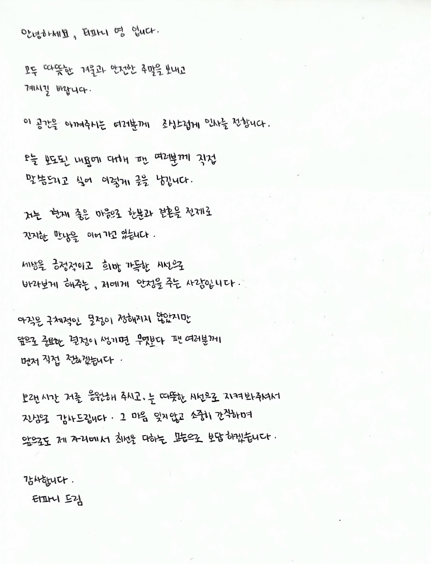 251213少女时代Tiffany/黄美英和卞耀汉官宣恋爱中 卞耀汉方官方立场:大家好,这里是是演员边耀汉的所属公司TEAMHOPE。目前两人正以结婚为前提真挚地交往中。虽然还没有具体确定结婚日程,但两位演员都传达了在决定的瞬间第一时间通知粉丝们的意愿。感谢大家的关注,请以祈祷两位的未来能以恩惠和爱相伴的心意给予祝福。Tiffany在INS上传亲笔信:大家好,我是Tiffany首先希望大家都在度过温暖冬天和安全的周末,喜欢这个空间的你们,小心翼翼地给你们打个招呼因为想亲自给大家说一下今天报道的内容,所以这样给大家写了一封信。现在的我正以积极的心态和一个人以结婚为前提真挚地交往中,尽管还没有确定具体日期,但是一旦有了重要的决定,会第一时间给粉丝们传递信息真心感谢一直以来支持我,用温暖的视线关注我的你们。我会铭记你们的真心,未来也会在我的位置上以全心努力的样子报答粉丝们,谢谢