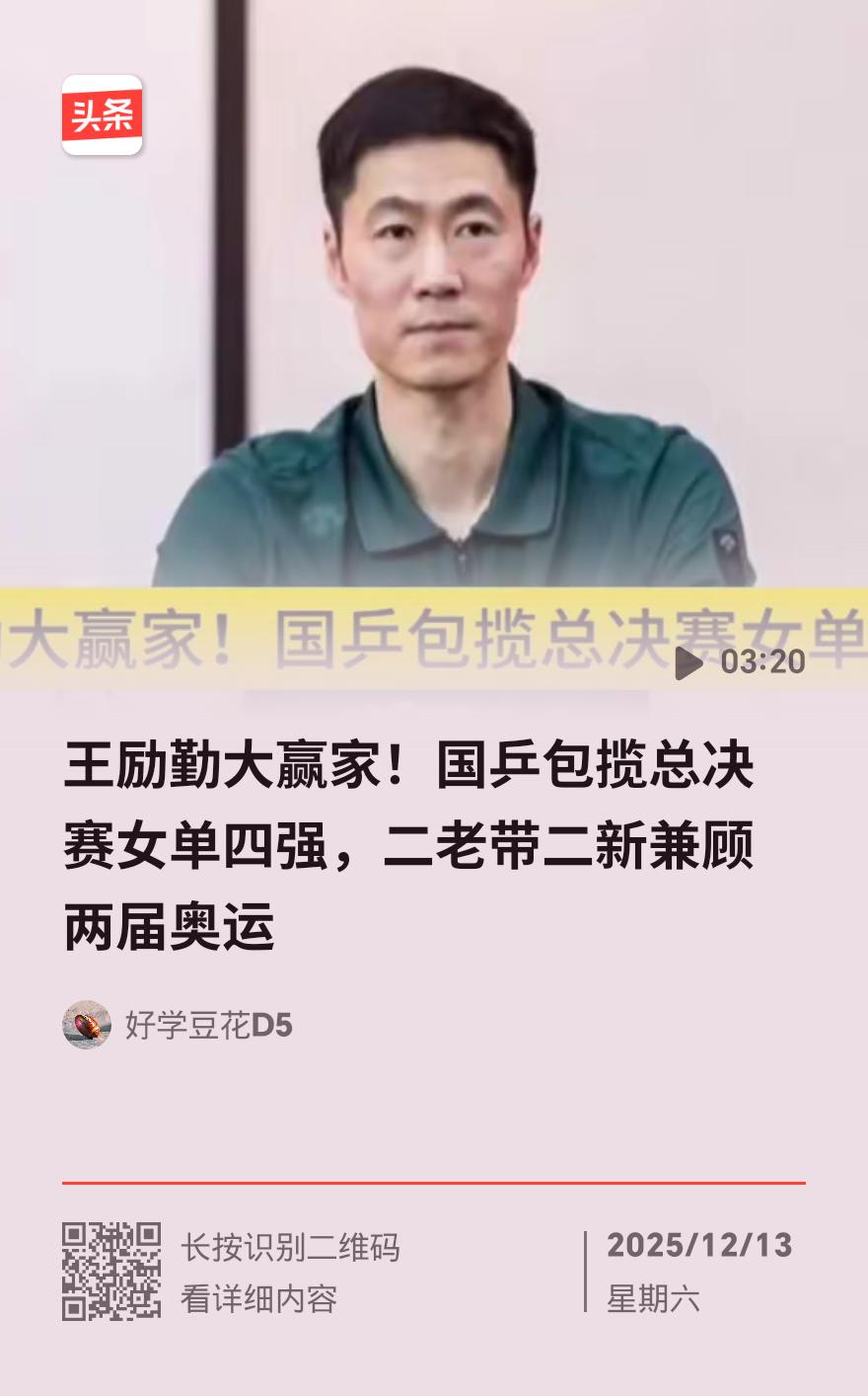 总决赛三日战罢!王励勤点名夸三人,国乒新老选手各显神通 WTT总决赛激战三天,国乒名宿王励勤赛后直接点名表扬三位选手,每一位的表现都可圈可点。 蒯曼堪称本次赛事的“抗日先锋”。她的签位堪称下下签,连续两轮都碰到日乒选手,扛着阻击劲敌的重任冲锋陷阵。小姑娘顶住压力稳扎稳打,不仅圆满完成任务,还成功和孙颖莎会师半决赛,尽显新生代球员的硬实力。 首次登上总决赛舞台的陈熠,也交出了亮眼答卷。赛场之上敢打敢拼,丝毫不见新人的怯场。更值得欣喜的是,她和蒯曼同龄,两人的强势崛起,让国乒女队的后备力量愈发厚实,未来有望为孙颖莎、王曼昱分担大赛压力。 王楚钦则展现了顶尖选手的超强调整能力。首轮对阵松岛辉空时,他状态低迷尽显疲态。所有人都替他捏一把汗的时候,他次轮迅速找回状态满血复活,以4-1的比分淘汰大布,强势晋级的同时,也让人看到了国乒主力的韧性。蒯曼 蒯曼女乒 蒯曼陈幸同 蒯曼女单冠军 马龙王励勤