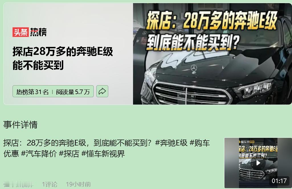 你信吗?28万真能开走奔驰E?刷到这价格我直接笑出声,这不扯呢!但仔细一扒,居然是真的——不过,坑都藏在了细节里。 说白了,这就是清库存的进口标轴版。轴距比国产版短一截,后排别说跷二郎腿,个子高的坐进去都顶腿。而且只有特定门店才有这价,你异地跑过去,路费加手续,最后可能比本地买国产长轴还贵。真实行情是,国产E级入门价其实在34万左右。所以别光看标题就上头,人家玩的是文字游戏。 那这车值不值?得看你要什么。要面子、要那块标,奔驰E的气场确实没得说,内饰豪华感同级几乎无敌。但你要是图实惠、顾家用,我劝你冷静。这价位的国产新能源,配置能甩它两条街,空间更大、用车成本还低得多。养一台E级,加油保养就跟碎钞似的,真心不轻松。 所以谁该冲?就两类人:非奔驰不买的铁粉,或者需要商务撑门面的老板。如果你过日子讲究性价比,平时拖家带口,还热爱科技感——快跑!别往里扔钱。 车子像包包,有人为 logo 刷卡不眨眼,有人则琢磨每分钱花得值不值。没有对错,只有合不合适。看清自己到底要什么,比盲冲“低价豪车”实在多了。