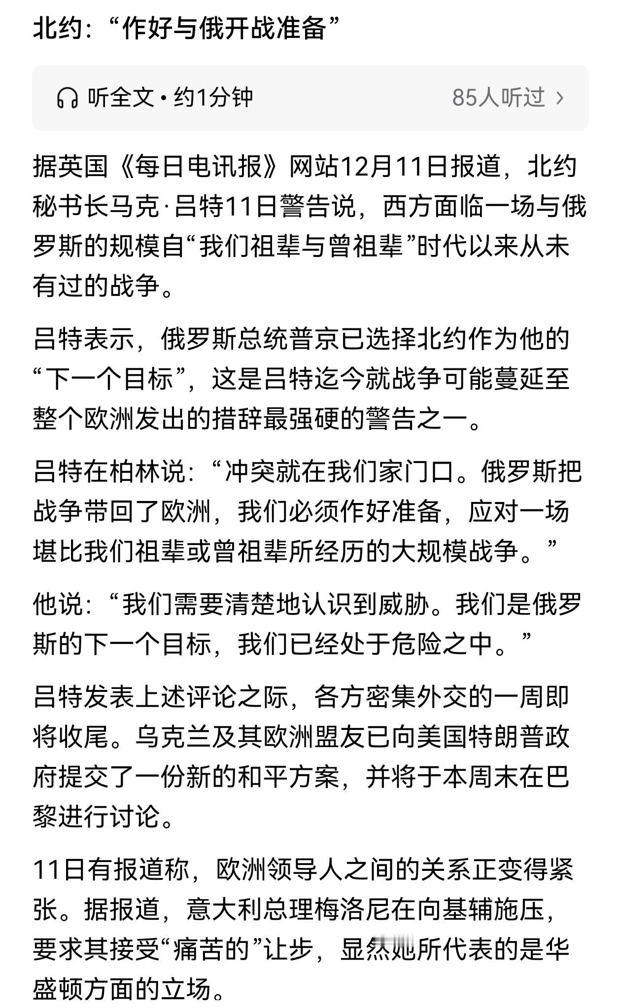 从北约秘书长吕特的讲话中可以窥见端倪,在乌克兰问题上,美国与欧洲之间存在着严重分歧。 吕特说俄罗斯下一个目标就是北约,几分真几分假,只有他自己清楚。但他的目的却很明确,那就是欧洲应该继续支持乌克兰,再加大力度,直到战胜俄罗斯。他渲染俄罗斯威胁论,就是想统一欧洲各国的意见,不能受美国的影响,要迅速的填补美国撤回支持乌克兰的空档,让乌克兰战斗到底,至于乌克兰人民的死活,乌克兰经济的破坏,则不在他的考虑范围之内。 他还是想的简单了,撇开美国的北约,还是北约吗?