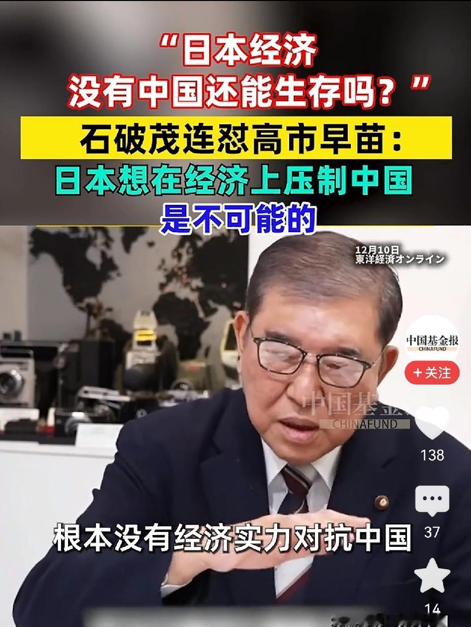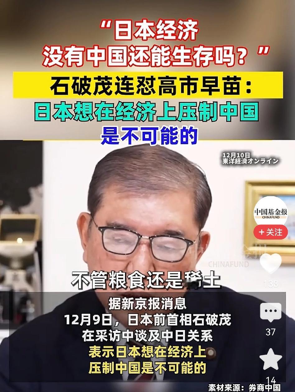 不得不说,在当前的日本政坛,日本前首相石破茂是少有的清醒派。近期石破茂在采访中反驳高市早苗关于日本可在经济上压制中国的立场,他直言日本经济是无法脱离中国生存的。 他进一步指出当前日本粮食自给率只有38% 、能源自给率 12% ,仅此两样,日本哪有资本谈能在经济上压制中国。此外在稀土资源方面,日本更是没法和中国相比,甚至还受制于中国,日本当前根本没有经济实力对抗中国。 高市早苗却没有看到这种形势,或者即使看到了也选择忽视,正式基于这种错误的认识,才有发表了错误言论,才不知悔改拒不撤回错误言论。真的假不了,错的也对不了,以弱击强,以虚击实,日本必将为自己错误判断付出代价。