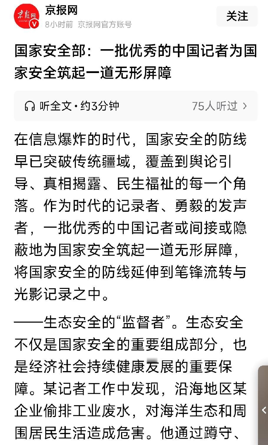 一批优秀的中国记者为国家安全筑起了一道无形的屏障。例如,在食品安全、食用油罐装车混装、环境污染、日本核污水排放入海等问题上,他们都发挥了重要作用。 感恩伟大的中国记者。特别要感谢央视驻联合国记者徐德智,他为我们揭露了以色列的虚伪面目。