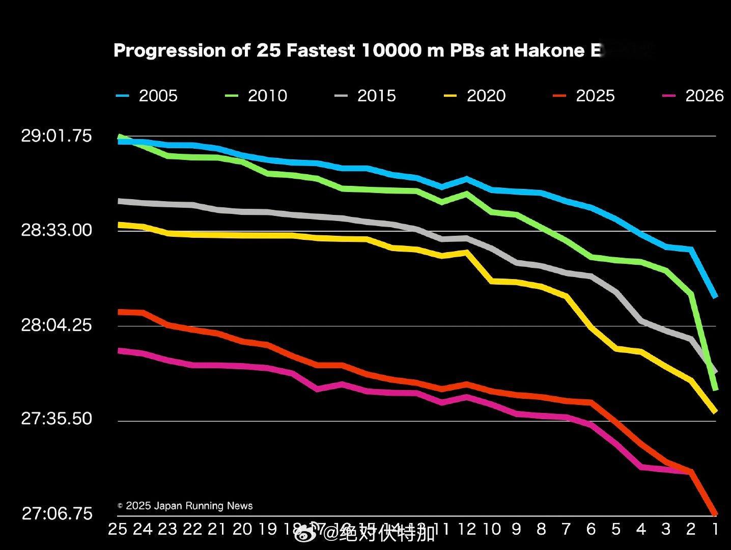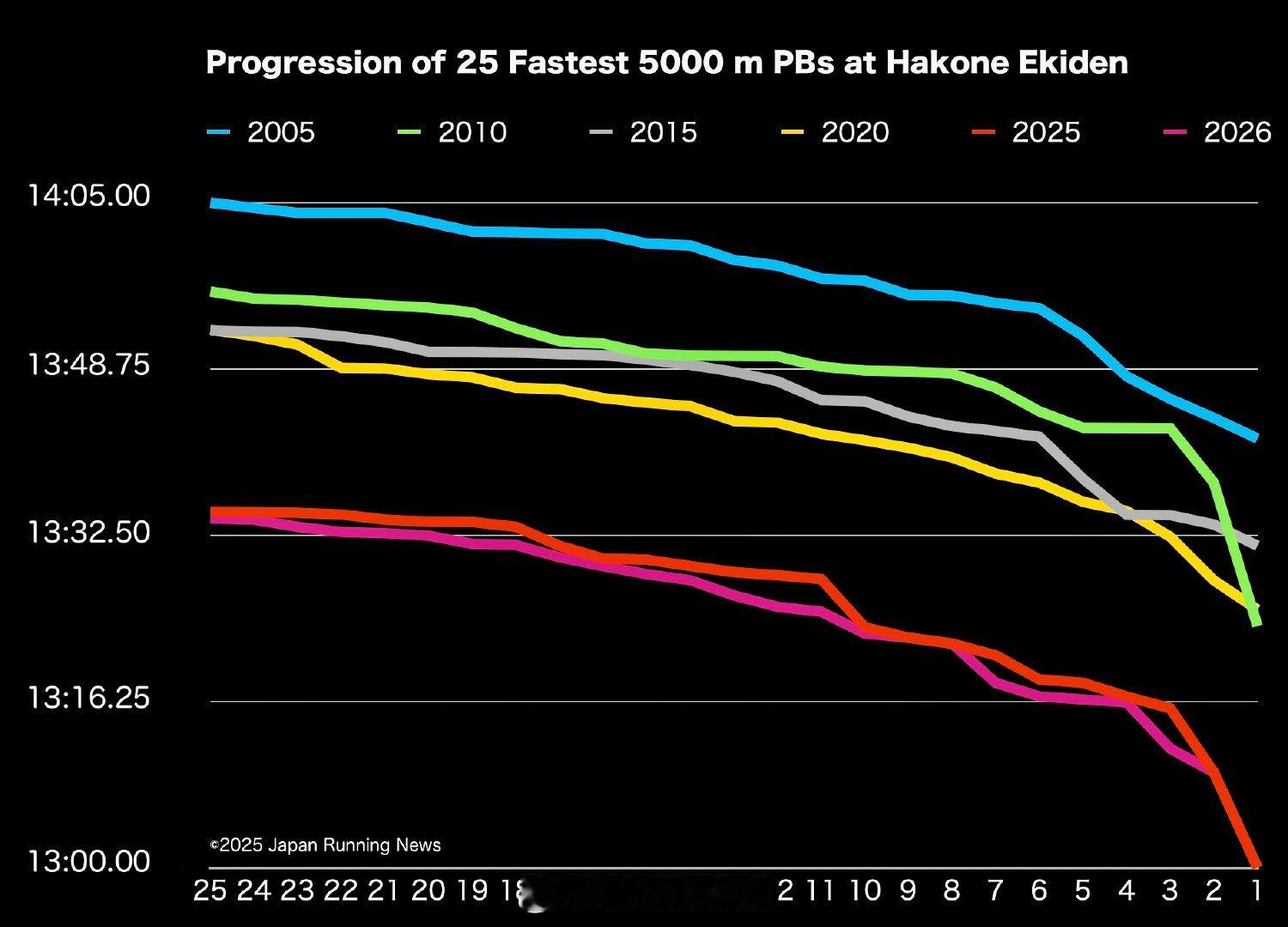 Japan Running News 统计的进入箱根驿传正赛队伍名单最快的25个5000米、10000米和半马成绩历年变化。进步真快啊。箱根驿传 第102回箱根驿传 长跑