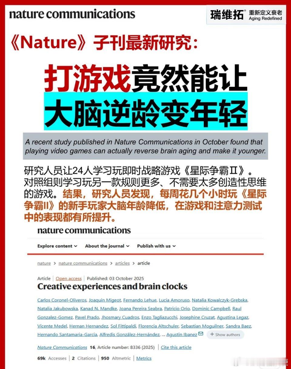 《Nature》最新研究表明,打游戏可以抗衰老,经常打游戏可以使你的大脑变年轻……!这下必须增加游戏时长了。