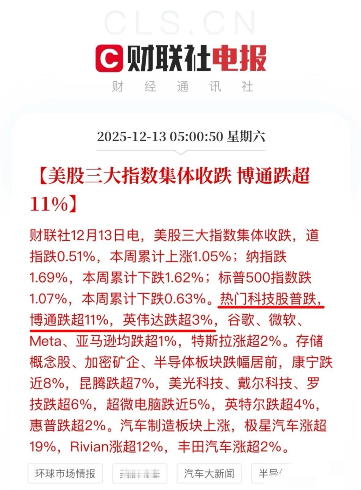 12.13美股收评:热门科技股普跌 博通跌超11%。 看看闪迪,下周一又要亏五个点。美股存储除了闪迪都是创新高了的正常回调,我们连前高都没摸到也学别人跌,跟跌不跟涨,哈哈可怜。