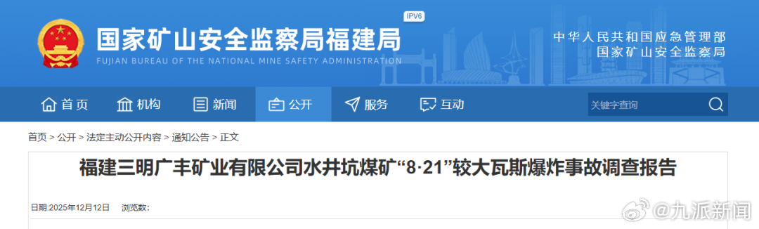 #福建一煤矿致7死1伤31人被问责#【#福建一煤矿致7死1伤调查报告#】12月12日,国家矿山安全监察局福建局发布《福建三明广丰矿业有限公司水井坑煤矿“8·21”较大瓦斯爆炸事故调查报告》。报告显示,2025年8月21日20时01分,福建省三明市广丰矿业有限公司水井坑煤矿(以下简称水井坑煤矿)发生一起较大瓦斯爆炸事故,造成7人遇难、1人轻微伤,直接经济损失约926万元。经调查认定,水井坑煤矿“8·21”较大瓦斯爆炸事故是一起因通风瓦斯管理不到位,掘进工作面遇地质构造,顶煤大量垮落,瓦斯涌出量积聚,作业人员违规打火抽烟导致的生产安全责任事故。事故调查组对31名责任人员和相关责任单位提出处理意见建议。其中:水井坑煤矿矿长目前已由公安机关刑事立案侦查,待司法机关作出处理后,按干部管理权限给予相应党纪政务处分,五年内不得担任任何生产经营单位主要负责人;水井坑煤矿总工程师、生产副矿长、安全副矿长、采掘队长、当班检身工等5名责任人员涉嫌犯罪,建议移送司法机关追究刑事责任;对水井坑煤矿机电副矿长等12人分别给予党纪政务处分、解除劳动合同等处理;对水井坑煤矿矿长等15名人员撤销或暂扣执业资格、特种作业操作证,对9名安全管理人员予以行政罚款,对3名人员扣罚1至3倍年终绩效;对永安煤业有限公司主要负责人等7人分别给予党纪政务处分、免职等处理;对福建省能化集团安监部门负责人给予诫勉处理;对大田县政府分管领导,大田县工业和信息化局主要负责人、煤炭管理局主要负责人,三明煤炭管理局安监科、行业管理科负责人等5人分别给予诫勉、政务处分处理。对水井坑煤矿罚款192.5万元、暂扣安全生产许可证;责成福建省能化集团、大田县人民政府、三明市工业和信息化局(煤炭管理局)作出深刻检查。