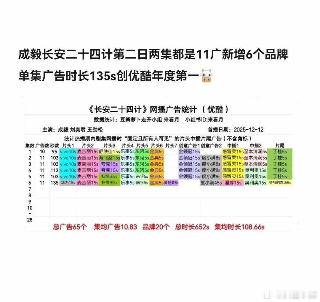 成毅长安二十四计第二天继续11广开局,新增6个品牌,单集广告时长135s创优酷2025年度第一🔥