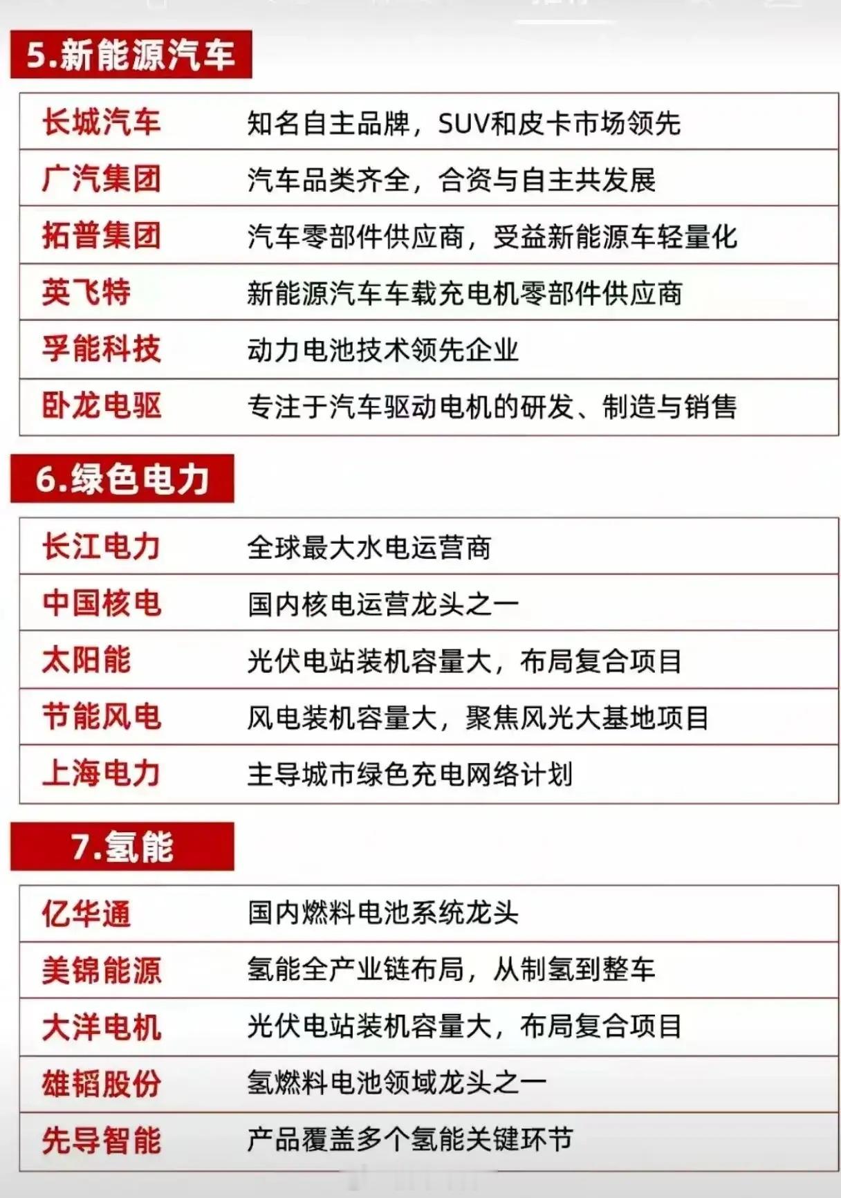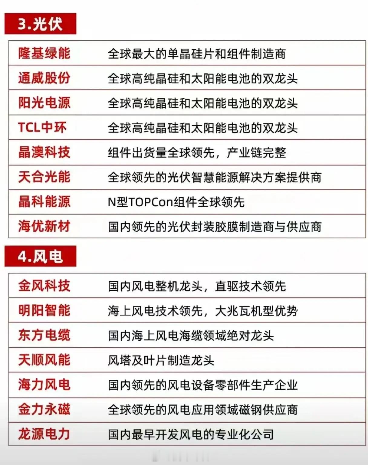 围绕新能源及相关产业,梳理了各领域龙头企业及其核心优势,内容总结如下:1. 锂电池领域:宁德时代为全球动力电池绝对龙头,技术领先;比亚迪是新能源汽车与电池双龙头,产业链完整;亿纬锂能布局锂电池多元化,覆盖动力与储能;恩捷股份为全球湿法隔膜龙头;璞泰来是人造石墨负极材料龙头;天赐材料为全球电解液龙头;先导智能是高端锂电池设备制造龙头;精测电子专注锂电池生产及检测设备。2. 储能领域:派能科技为户用储能龙头,海外市场占比高;固德威是储能变流器(PCS)领域代表企业;南网储能抽水蓄能电站装机容量大,布局多种储能技术;阳光电源是全球经验丰富的储能设备及系统解决方案供应商;华宝新能为全球便携储能领域领军企业;昱能科技在电池领域主要布局储能产品。3. 光伏领域:隆基绿能是全球最大的单晶硅片和组件制造商;通威股份、阳光电源、TCL中环均为全球高纯晶硅和太阳能电池的双龙头;晶澳科技组件出货量全球领先且产业链完整;天合光能是全球领先的光伏智慧能源解决方案提供商;晶科能源N型TOPCon组件全球领先;海优新材是国内领先的光伏封装胶膜制造商与供应商。4. 风电领域:金风科技为国内风电整机龙头,直驱技术领先;明阳智能海上风电技术领先,大兆瓦机型优势突出;东方电缆是国内海上风电海缆领域绝对龙头;天顺风能是风塔及叶片制造龙头;海力风电是国内领先的风电设备零部件生产企业;金力永磁是全球领先的风电应用领域磁钢供应商;龙源电力是国内最早开发风电的专业化公司。5. 新能源汽车领域:长城汽车是知名自主品牌,在SUV和皮卡市场领先;广汽集团汽车品类齐全,合资与自主共同发展;拓普集团为汽车零部件供应商,受益于新能源车轻量化趋势;英飞特是新能源汽车车载充电机零部件供应商;孚能科技是动力电池技术领先企业;卧龙电驱专注于汽车驱动电机的研发、制造与销售。6. 绿色电力领域:长江电力是全球最大水电运营商;中国核电是国内核电运营龙头之一;太阳能光伏电站装机容量大,布局复合项目;节能风电风电装机容量大,聚焦风光大基地项目;上海电力主导城市绿色充电网络计划。7. 氢能领域:亿华通是国内燃料电池系统龙头;美锦能源实现氢能全产业链布局,覆盖制氢到整车环节;大洋电机光伏电站装机容量大,布局复合项目(注:原文此处描述或存在笔误);雄韬股份是氢燃料电池领域龙头之一;先导智能产品覆盖多个氢能关键环节。