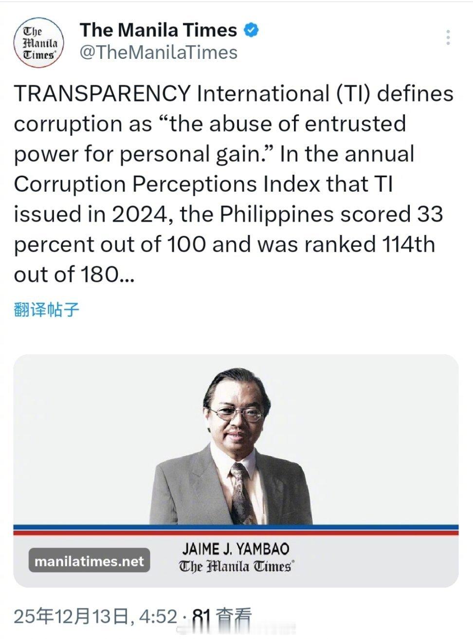 在2024年发布的年度腐败指数中,菲律宾仅得到33分,在180个国家中排名第114位。《马尼拉时报》预计今年菲律宾的指数得分和排名将进一步下滑,因为全球主流媒体和社会媒体对近期爆发的防洪资金丑闻及其引发的大规模示威活动进行了广泛报道。最初,一些从未被洪水侵袭过的地区出现了膝部高度的洪水,引起了媒体关注。总统小费迪南德·马科斯解释,台风强度超出了泵站和其他防洪措施的应对能力。然而,在公众投诉和媒体曝光后,情况急转直下,揭露了许多防洪项目实际上并不存在、使用了劣质材料或处于未完工状态。截至本文撰写时,持续的调查已发现,在已拨付公共资金的8000个防洪项目中,有421个被确认为“幽灵工程”(仍有11万个项目待调查)。