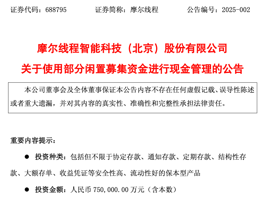 摩尔线程(688795)12月12日晚间公告称,拟使用不超过75亿元的部分闲置募