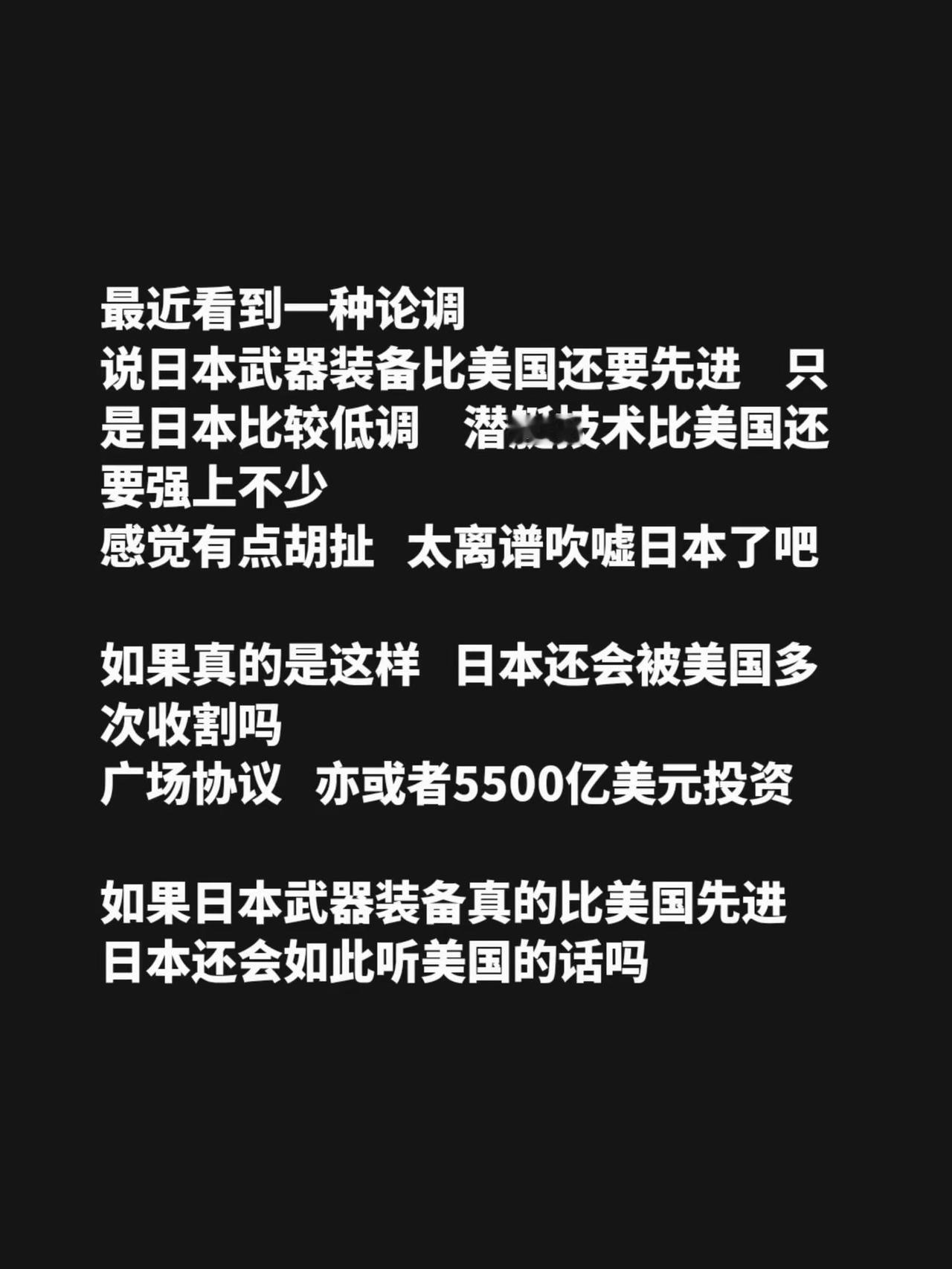 最近看到一种论调说日本武器装备比美国还要先进 只是日本比较低调 潜艇技术比美国还要强上不少感觉有点胡扯 太离谱吹嘘日本了吧如果真的是这样 日本还会被美国多次收割吗广场协议 亦或者5500亿美元投资 如果日本武器装备真的比美国先进日本还会如此听美国的话吗