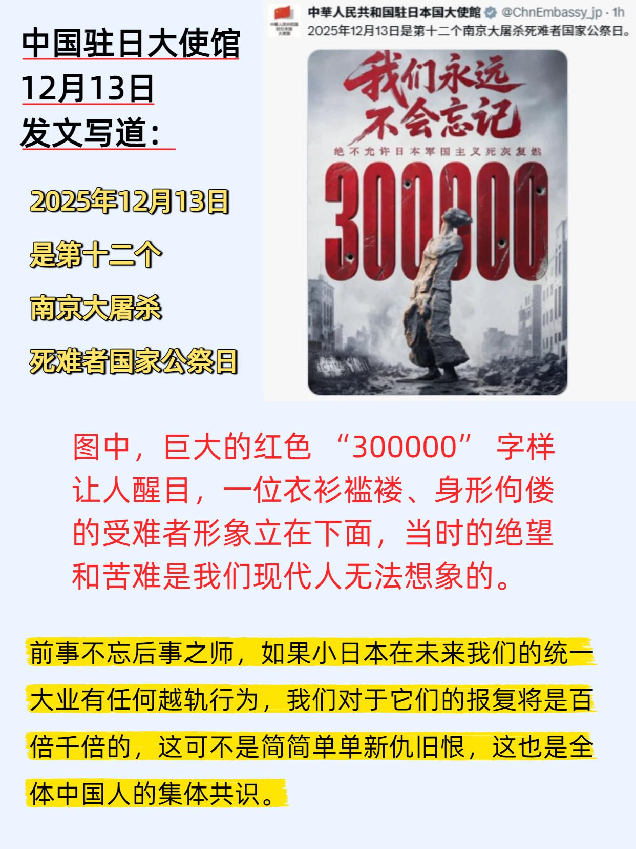 今天 2025.12.13 是我国第十二个南京大屠杀死难者国家公祭日 历史不应该被淡化和遗忘,更不应该被篡写,日本的历史教科书,不承认南京大屠杀的事实,对于七七事变也是一笔带过,说是中日矛盾才引发的战争。 这说明在日本的平民眼里,他们是正义的,可能还是受害者。 作为中国人,华夏儿郎们,子孙后代们,我们应该牢牢记住,日本是残害我国的刽子手,他们的屠刀不仅攻击军人,对平民老百姓更是残忍。勿忘国耻 牢记历史