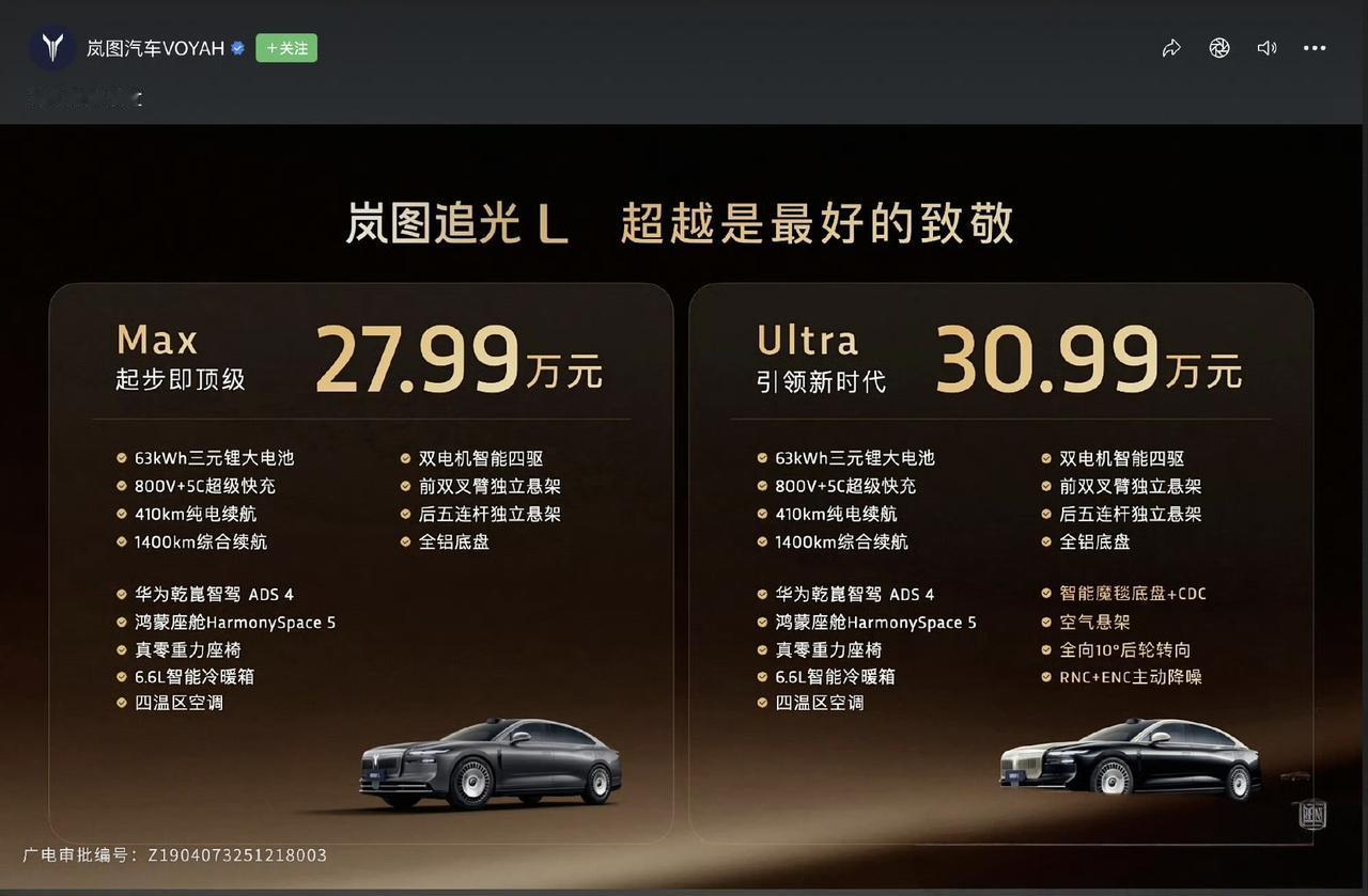 今年最后一台旗舰行政轿车,几乎所有的配置都拉满了,买这车真是不亏,所有的技术都是最先进的。 江湖人称小尊界,比享界S9还划算一点,27.9万起步,闭眼入。 30万级豪华轿车首选岚图追光L【来自懂车帝车友圈】