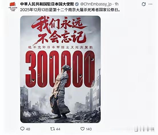 中国驻日大使馆今天(12月13日)发文写道:2025年12月13日是第十二个南京大屠杀死难者国家公祭日,并附图,图中,巨大的红色 “300000” 字样让人醒目,一位衣衫褴褛、身形佝偻的受难者形象立在下面,当时的绝望和苦难是我们现代人无法想象的。 对此,山东网友的评论绝了! 满江红 公祭 警钟长鸣,碑墙下、一片泪目。馆廊处、解说悲愤,沉重脚步。字字证言血泪史,累累白骨无声诉。公祭日,牢记石头城,倭寇屠。 长心碎,冤魂哭;永警醒,家国辱。甘洒一腔血,誓抵外侮。履兴邦责献丹心,尽爱国力看匹夫。齐奋起,直面顽寇虏,全征服。 是啊,铭记历史,勿忘国耻!缅怀先烈,致敬英雄!