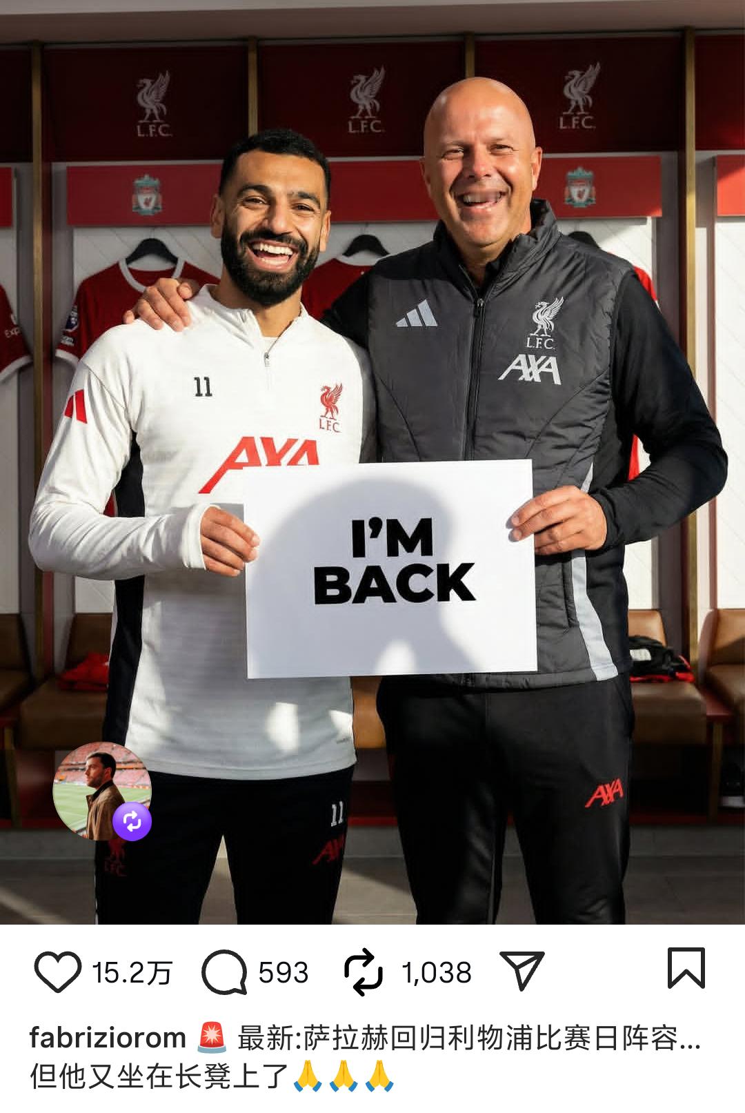罗马诺爆料,萨拉赫回来了,但在板凳上。萨拉赫利物浦