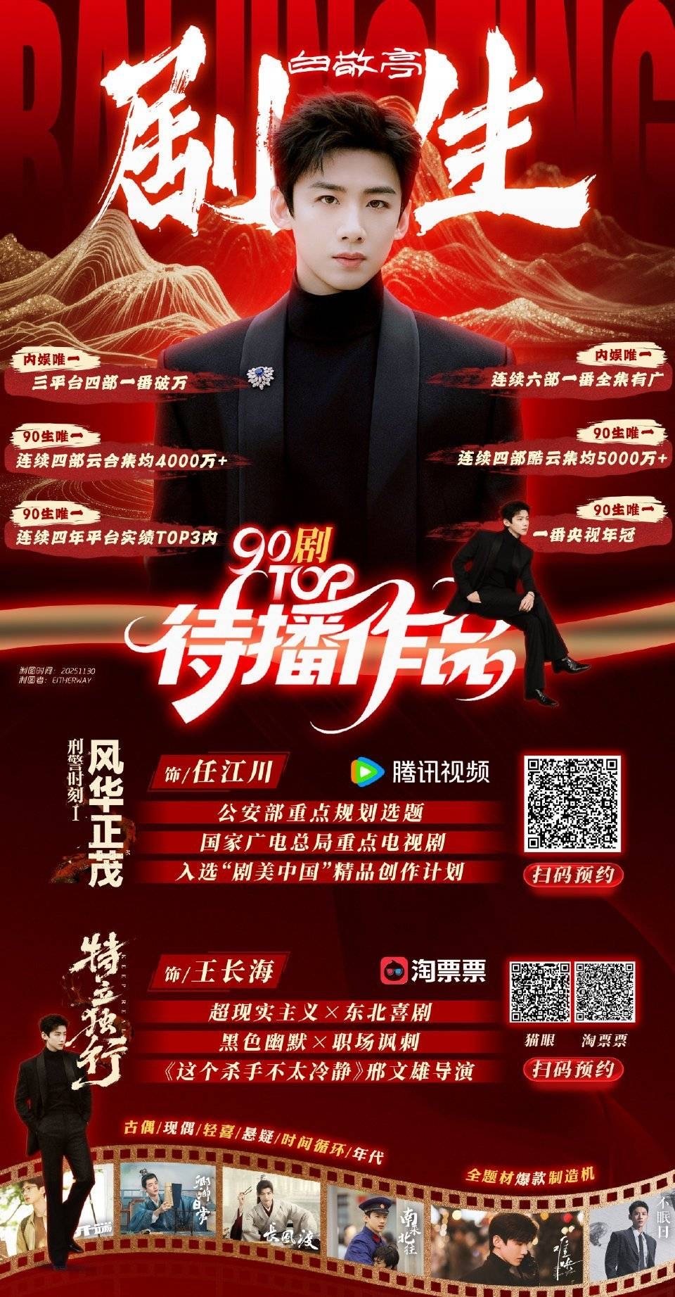 白敬亭这实绩确实蛮牛的,90生唯一三平台破万的,戏路宽回报率高,网播收视都扛的起
