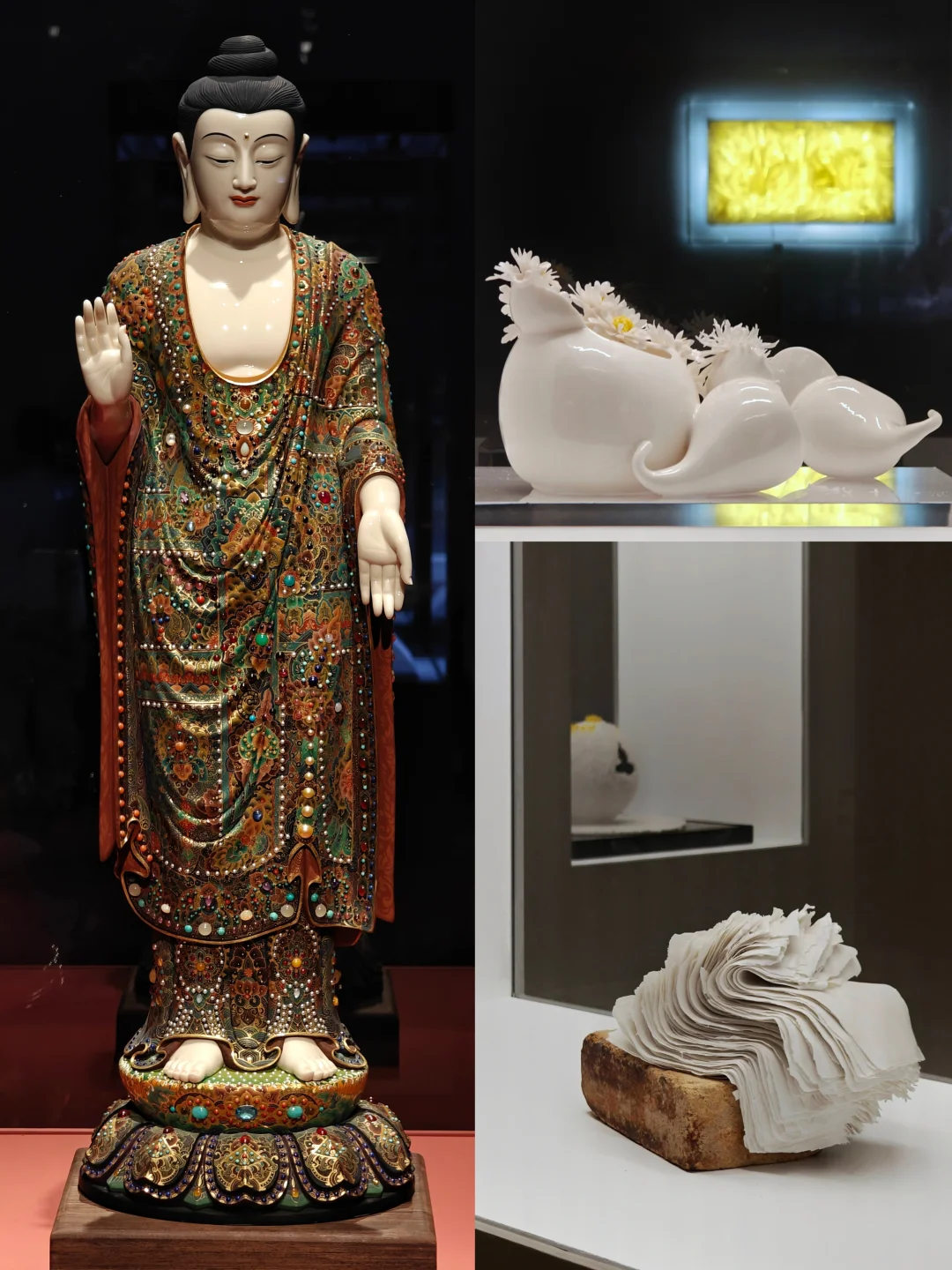 📸必打卡:当代作品《神话》(“网红”玉漱公主)、德化瓷“代言人”苏献忠代表作《纸》 、承载上海世博会记忆的《世博和鼎》 、结合唐卡绘画工艺的《极彩·如愿佛》