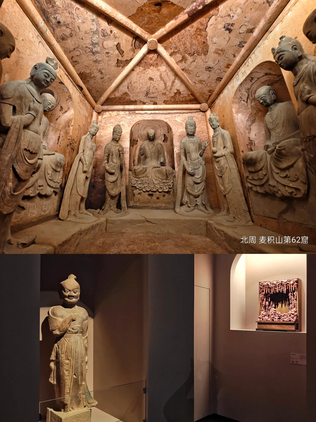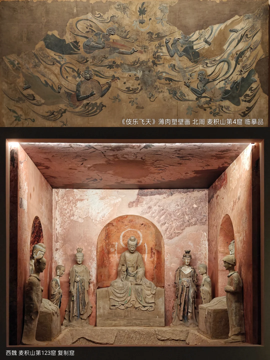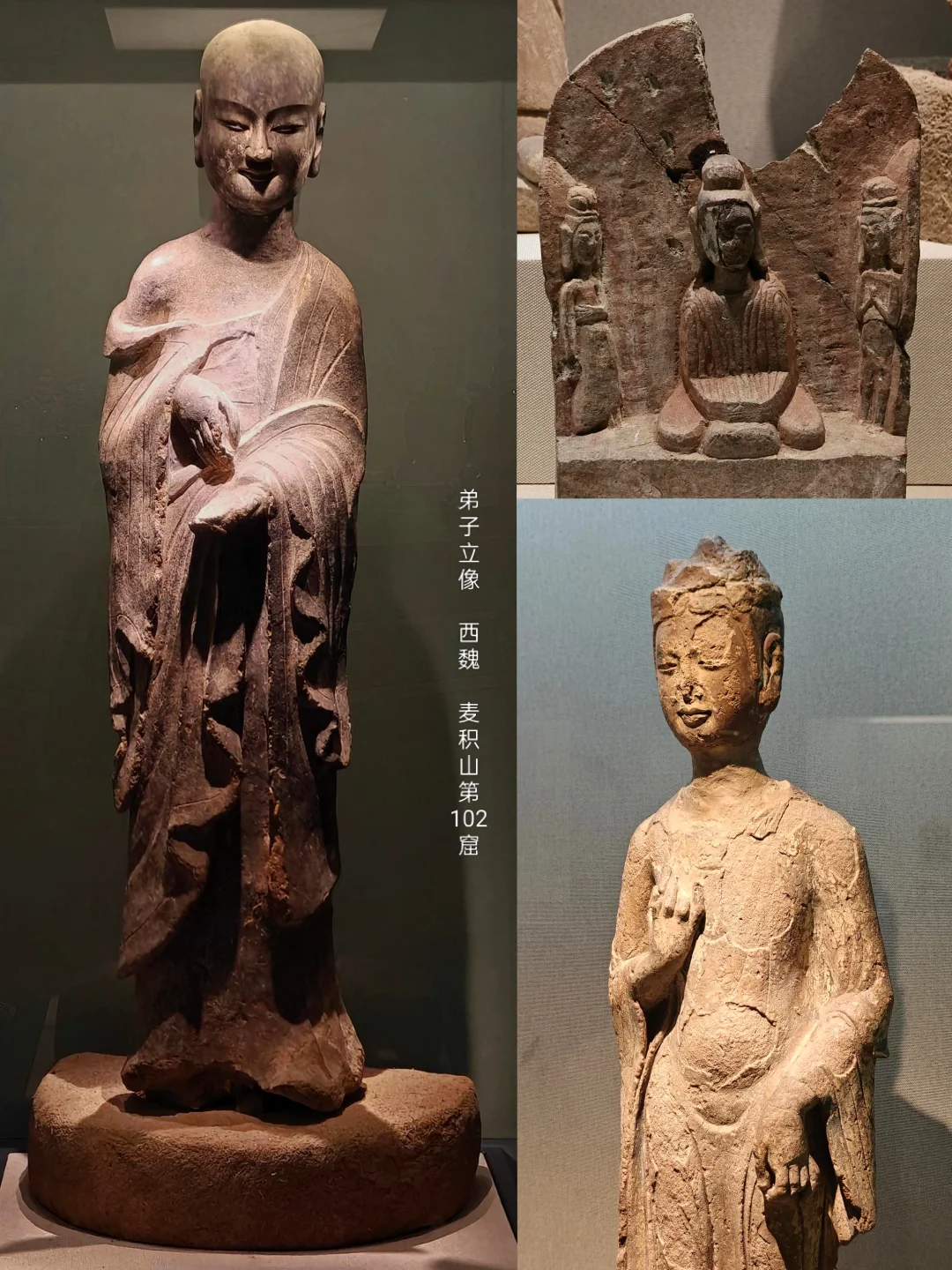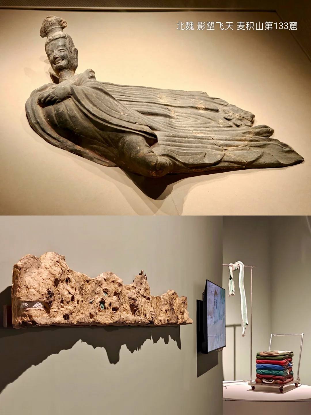 穿越时空的凝视:麦积山石窟艺术的千年回响\n📅10.26🔚\n⏰10:00-18:00 周一闭馆\n📍宝龙美术馆7、8号厅漕宝路3055弄\n🎫单人88/双人148\n\t\n🟤上篇介绍了展览总体情况,本篇具体介绍部分重点展品\n\t\n🔸北魏133窟微笑小沙弥立像(复制件)\n“万佛洞”是麦积山石窟内部空间蕞大、内容蕞丰富、精品蕞多的洞窟。这尊小沙弥以天真烂漫的稚态和含蓄内敛的微笑闻名,高不足1米,身着不合身袈裟,嘴角微扬,传递出质朴的喜悦与佛国安宁的意境\u200c\n\t\n🔸宋133窟释迦会子(复制件)\n通过衣纹写实与神情微妙变化,将宗教神圣性与人间亲情融合。佛祖右手悬于罗睺罗头顶,欲触未触,既流露对六年未见的愧疚与慈爱,又需保持庄严法相;罗睺罗合十低眉,温顺中透出对父爱的渴望\u200c\n\t\n🔸北魏133窟影塑飞天\n影塑以泥、细砂、麦秸为原料,通过泥范翻制后敷彩,背面粘贴于壁面,正面呈浮雕状,多用于衬托主像圆塑\u200c。此飞天原为龛楣装饰,身体高浮雕,衣带浅浮雕,造型清秀灵动,衣裙帔帛自然飘拂,衣纹疏密有致,传递出恬静安详的意境\u200c\n\t\n🔸北魏133窟石雕佛传故事碑(复制件)\n释迦牟尼\"八相成道\"故事与三世佛说法图。上部释迦多宝二佛并坐像,中部乘象入胎、降魔成道等场景,下部初转法轮、文殊问疾等说法图。融合《法华经》思想与维摩诘信仰,构图细密流畅,人物逾百,展现北魏佛教艺术从秀骨清像向写实风格的转变\u200c\n\t\n🔸北魏127窟睒子本生壁画(复制件)\n麦积山石窟规模蕞大、保存蕞完整的北魏佛传故事画,融合佛教孝道思想与本土伦理,以连续长卷形式描绘了睒子孝养盲父母、国王误射及天神救赎的完整故事\u200c,人物逾百,构图严谨,色彩古拙强烈,山石建筑错落有致,展现了北朝绘画从疏体向密体的过渡\n\t\n🔸北魏121窟“窃窃私语”螺髻梵王与菩萨像(复制件)\n突破传统佛教造像肃穆风格,首创“对话式”构图。塑像体现“褒衣博带”风格,衣袂轻垂,璎珞精致,面部含笑,神情含蓄而富有生活气息\u200c\n\t\n🔸北周4窟“薄肉塑”飞天壁画(复制件)\n创新技法使飞天形象\"破壁欲飞”。人物裸露肌肤部分采用0.5厘米厚的浅浮雕泥塑,衣饰飘带则以平面壁画呈现,形成立体与平面交融的视觉效果\u200c\n\t\n🔸北周197窟泥塑坐佛\n敦厚质朴,珠圆玉润,饱满而不张扬。衣纹呈现极富动感与装饰性的层叠状波浪\n\t\n⚠️字数限制,剩余见评论区。\n抬头看艺术 艺术漫游 东方的微笑 上海看展 值得看的展览安利