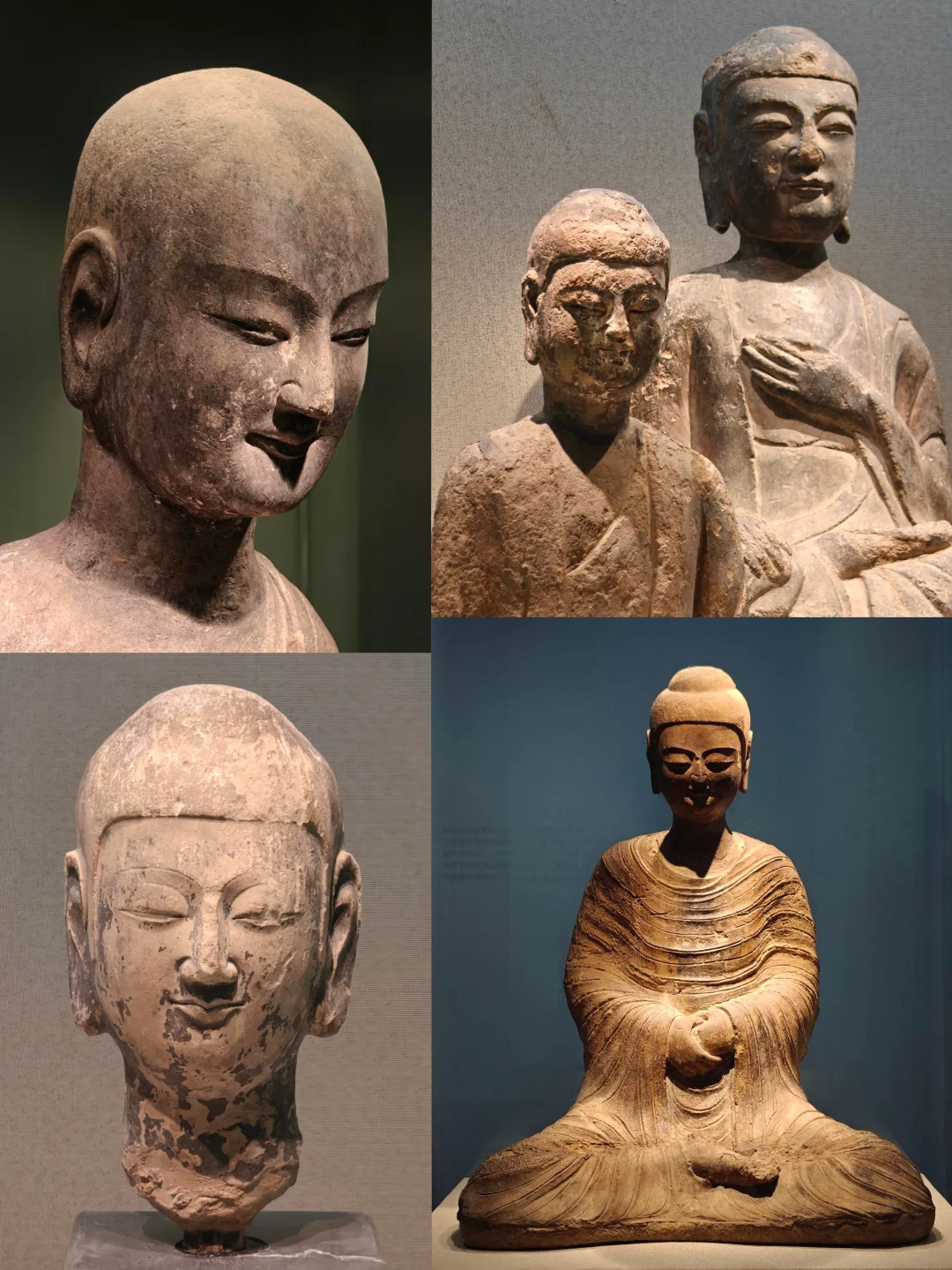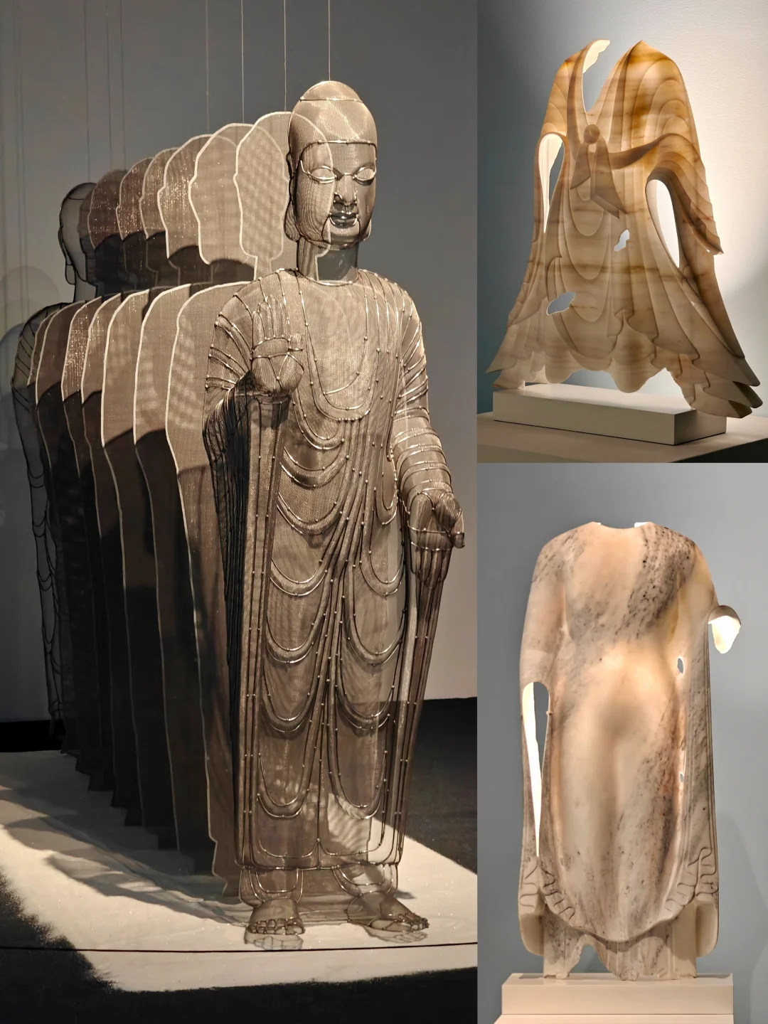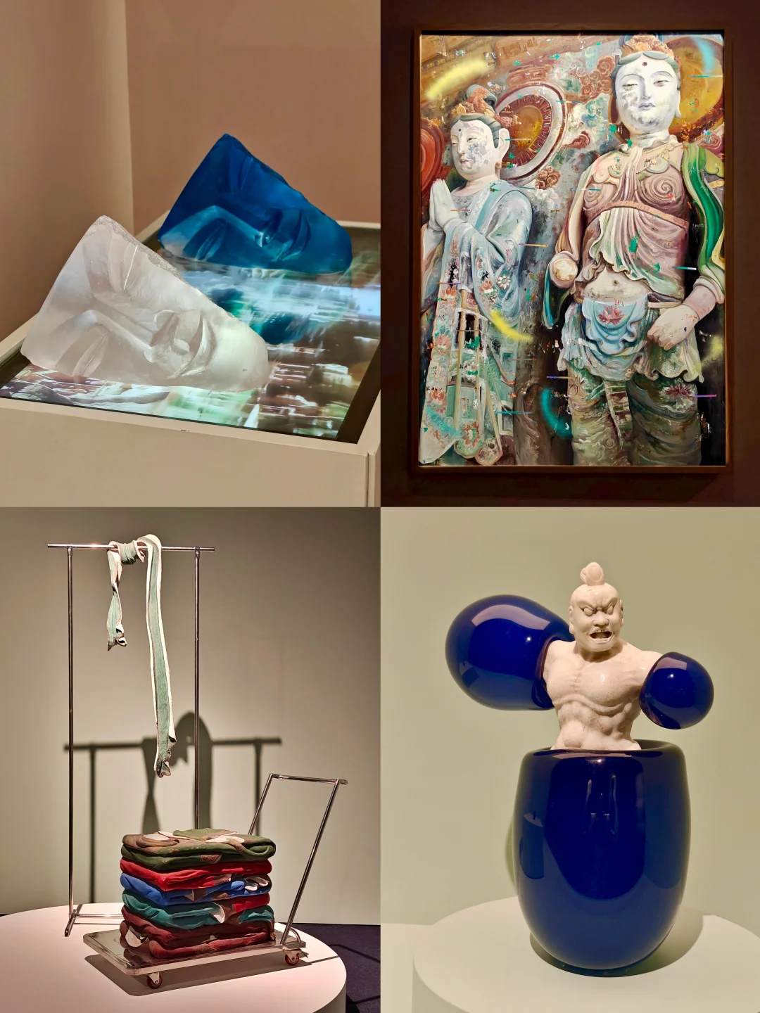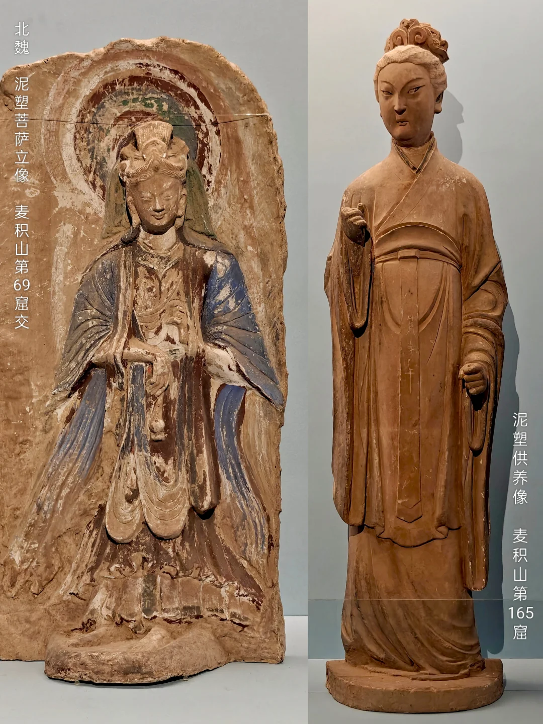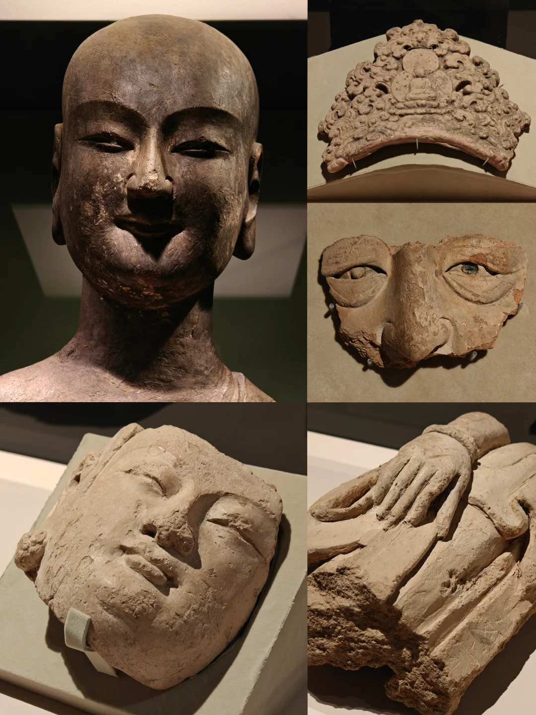 穿越时空的凝视:麦积山石窟艺术的千年回响\n📅10.26🔚\n⏰10:00-18:00 周一闭馆\n📍宝龙美术馆7、8号厅漕宝路3055弄\n🎫单人88/双人148\n\t\n🟤上篇介绍了展览总体情况,本篇具体介绍部分重点展品\n\t\n🔸北魏133窟微笑小沙弥立像(复制件)\n“万佛洞”是麦积山石窟内部空间蕞大、内容蕞丰富、精品蕞多的洞窟。这尊小沙弥以天真烂漫的稚态和含蓄内敛的微笑闻名,高不足1米,身着不合身袈裟,嘴角微扬,传递出质朴的喜悦与佛国安宁的意境\u200c\n\t\n🔸宋133窟释迦会子(复制件)\n通过衣纹写实与神情微妙变化,将宗教神圣性与人间亲情融合。佛祖右手悬于罗睺罗头顶,欲触未触,既流露对六年未见的愧疚与慈爱,又需保持庄严法相;罗睺罗合十低眉,温顺中透出对父爱的渴望\u200c\n\t\n🔸北魏133窟影塑飞天\n影塑以泥、细砂、麦秸为原料,通过泥范翻制后敷彩,背面粘贴于壁面,正面呈浮雕状,多用于衬托主像圆塑\u200c。此飞天原为龛楣装饰,身体高浮雕,衣带浅浮雕,造型清秀灵动,衣裙帔帛自然飘拂,衣纹疏密有致,传递出恬静安详的意境\u200c\n\t\n🔸北魏133窟石雕佛传故事碑(复制件)\n释迦牟尼\"八相成道\"故事与三世佛说法图。上部释迦多宝二佛并坐像,中部乘象入胎、降魔成道等场景,下部初转法轮、文殊问疾等说法图。融合《法华经》思想与维摩诘信仰,构图细密流畅,人物逾百,展现北魏佛教艺术从秀骨清像向写实风格的转变\u200c\n\t\n🔸北魏127窟睒子本生壁画(复制件)\n麦积山石窟规模蕞大、保存蕞完整的北魏佛传故事画,融合佛教孝道思想与本土伦理,以连续长卷形式描绘了睒子孝养盲父母、国王误射及天神救赎的完整故事\u200c,人物逾百,构图严谨,色彩古拙强烈,山石建筑错落有致,展现了北朝绘画从疏体向密体的过渡\n\t\n🔸北魏121窟“窃窃私语”螺髻梵王与菩萨像(复制件)\n突破传统佛教造像肃穆风格,首创“对话式”构图。塑像体现“褒衣博带”风格,衣袂轻垂,璎珞精致,面部含笑,神情含蓄而富有生活气息\u200c\n\t\n🔸北周4窟“薄肉塑”飞天壁画(复制件)\n创新技法使飞天形象\"破壁欲飞”。人物裸露肌肤部分采用0.5厘米厚的浅浮雕泥塑,衣饰飘带则以平面壁画呈现,形成立体与平面交融的视觉效果\u200c\n\t\n🔸北周197窟泥塑坐佛\n敦厚质朴,珠圆玉润,饱满而不张扬。衣纹呈现极富动感与装饰性的层叠状波浪\n\t\n⚠️字数限制,剩余见评论区。\n抬头看艺术 艺术漫游 东方的微笑 上海看展 值得看的展览安利