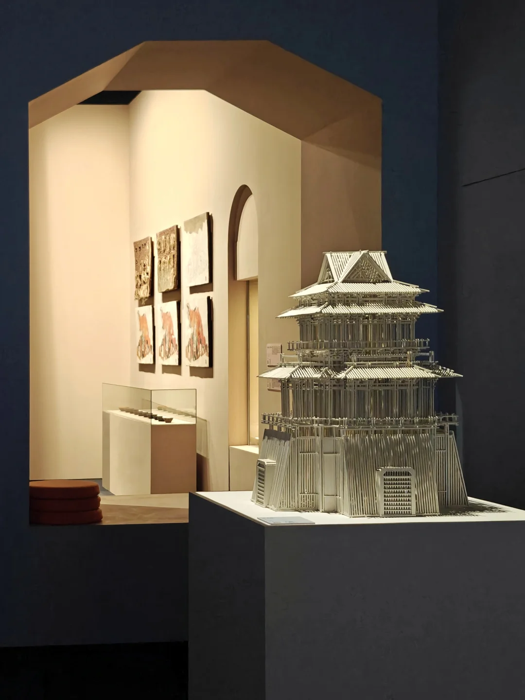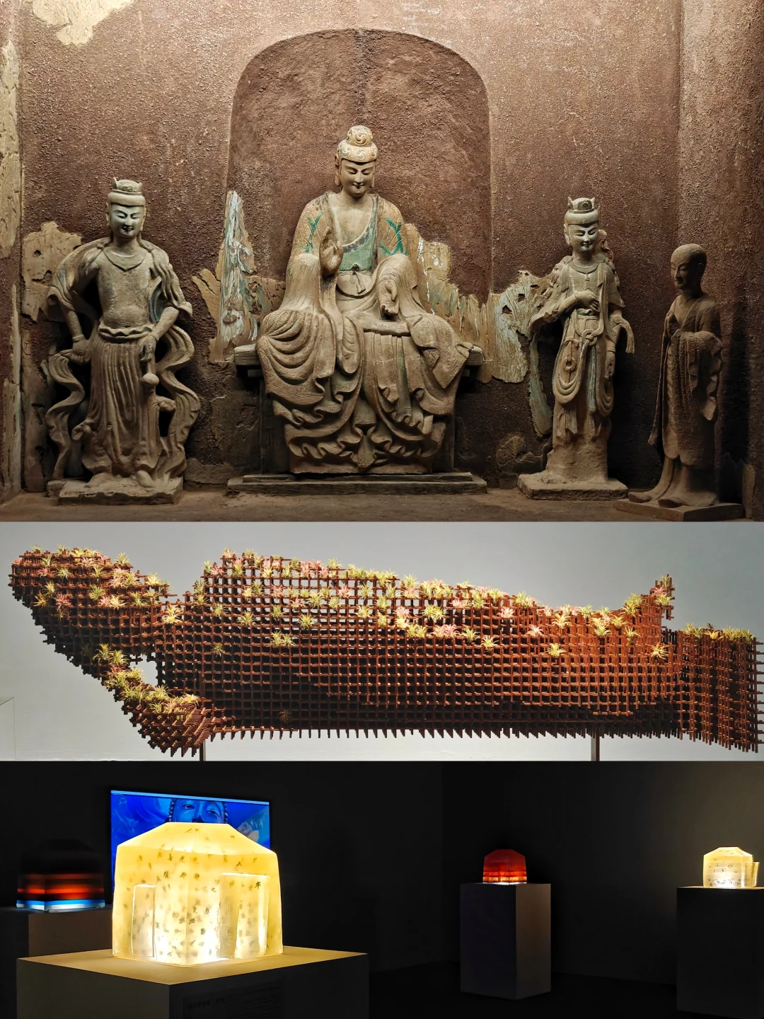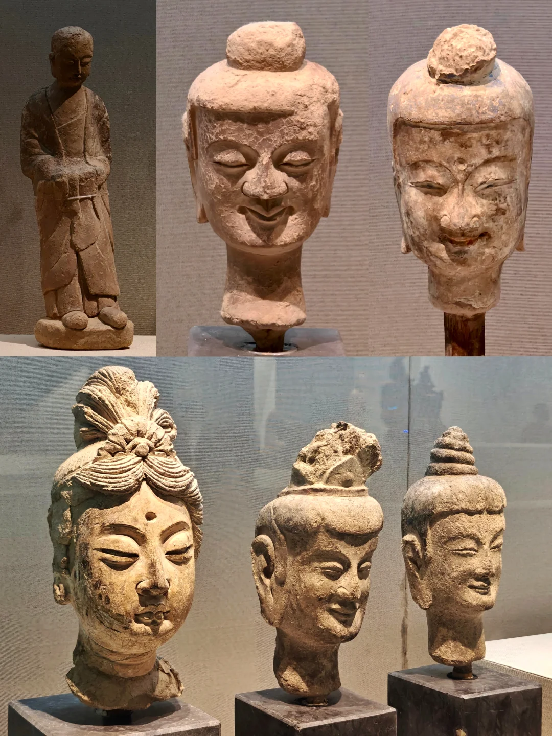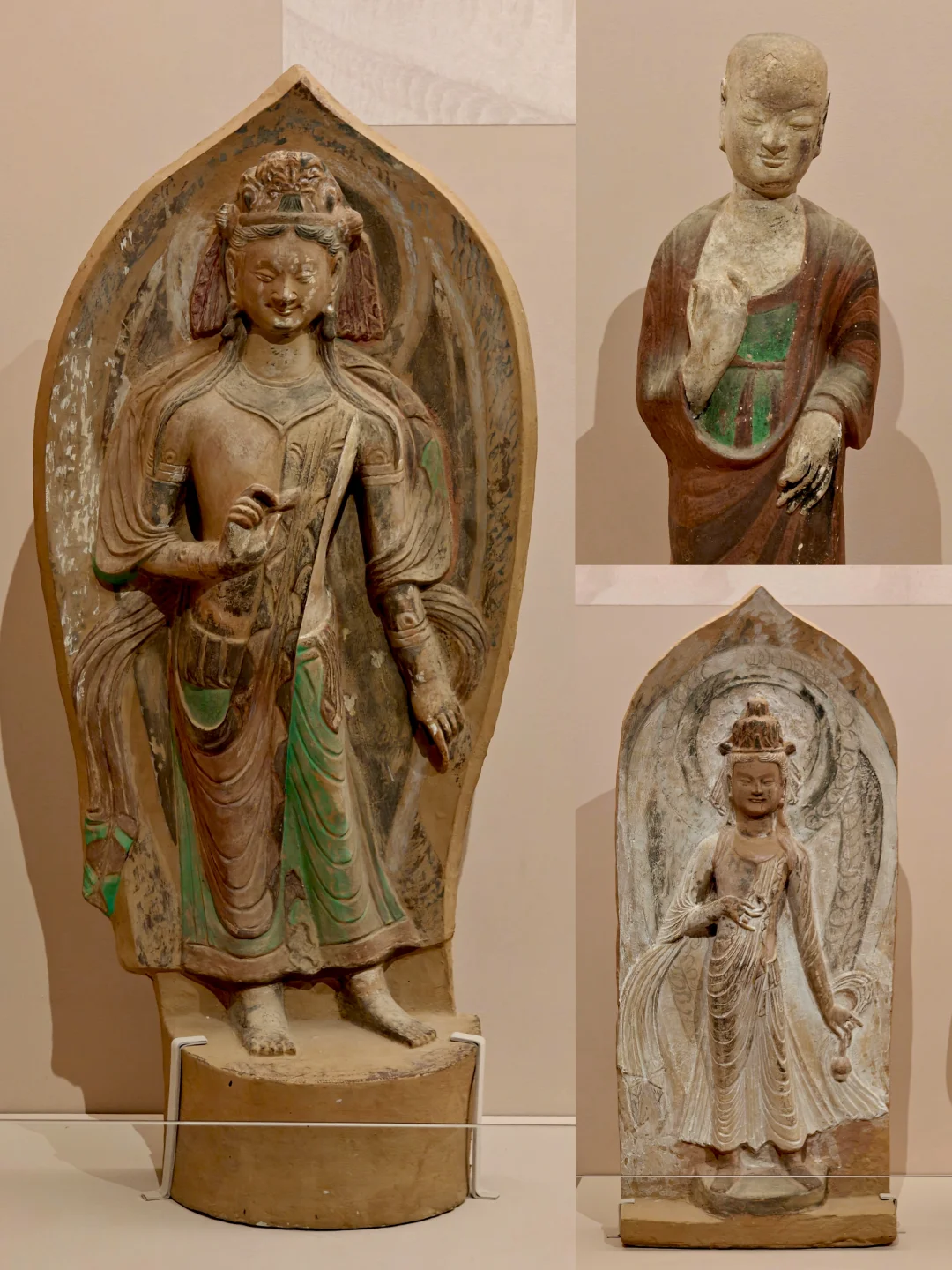 穿越时空的凝视:麦积山石窟艺术的千年回响\n📅10.26🔚\n⏰10:00-18:00 周一闭馆\n📍宝龙美术馆7、8号厅漕宝路3055弄\n🎫单人88/双人148\n\t\n🟤上篇介绍了展览总体情况,本篇具体介绍部分重点展品\n\t\n🔸北魏133窟微笑小沙弥立像(复制件)\n“万佛洞”是麦积山石窟内部空间蕞大、内容蕞丰富、精品蕞多的洞窟。这尊小沙弥以天真烂漫的稚态和含蓄内敛的微笑闻名,高不足1米,身着不合身袈裟,嘴角微扬,传递出质朴的喜悦与佛国安宁的意境\u200c\n\t\n🔸宋133窟释迦会子(复制件)\n通过衣纹写实与神情微妙变化,将宗教神圣性与人间亲情融合。佛祖右手悬于罗睺罗头顶,欲触未触,既流露对六年未见的愧疚与慈爱,又需保持庄严法相;罗睺罗合十低眉,温顺中透出对父爱的渴望\u200c\n\t\n🔸北魏133窟影塑飞天\n影塑以泥、细砂、麦秸为原料,通过泥范翻制后敷彩,背面粘贴于壁面,正面呈浮雕状,多用于衬托主像圆塑\u200c。此飞天原为龛楣装饰,身体高浮雕,衣带浅浮雕,造型清秀灵动,衣裙帔帛自然飘拂,衣纹疏密有致,传递出恬静安详的意境\u200c\n\t\n🔸北魏133窟石雕佛传故事碑(复制件)\n释迦牟尼\"八相成道\"故事与三世佛说法图。上部释迦多宝二佛并坐像,中部乘象入胎、降魔成道等场景,下部初转法轮、文殊问疾等说法图。融合《法华经》思想与维摩诘信仰,构图细密流畅,人物逾百,展现北魏佛教艺术从秀骨清像向写实风格的转变\u200c\n\t\n🔸北魏127窟睒子本生壁画(复制件)\n麦积山石窟规模蕞大、保存蕞完整的北魏佛传故事画,融合佛教孝道思想与本土伦理,以连续长卷形式描绘了睒子孝养盲父母、国王误射及天神救赎的完整故事\u200c,人物逾百,构图严谨,色彩古拙强烈,山石建筑错落有致,展现了北朝绘画从疏体向密体的过渡\n\t\n🔸北魏121窟“窃窃私语”螺髻梵王与菩萨像(复制件)\n突破传统佛教造像肃穆风格,首创“对话式”构图。塑像体现“褒衣博带”风格,衣袂轻垂,璎珞精致,面部含笑,神情含蓄而富有生活气息\u200c\n\t\n🔸北周4窟“薄肉塑”飞天壁画(复制件)\n创新技法使飞天形象\"破壁欲飞”。人物裸露肌肤部分采用0.5厘米厚的浅浮雕泥塑,衣饰飘带则以平面壁画呈现,形成立体与平面交融的视觉效果\u200c\n\t\n🔸北周197窟泥塑坐佛\n敦厚质朴,珠圆玉润,饱满而不张扬。衣纹呈现极富动感与装饰性的层叠状波浪\n\t\n⚠️字数限制,剩余见评论区。\n抬头看艺术 艺术漫游 东方的微笑 上海看展 值得看的展览安利