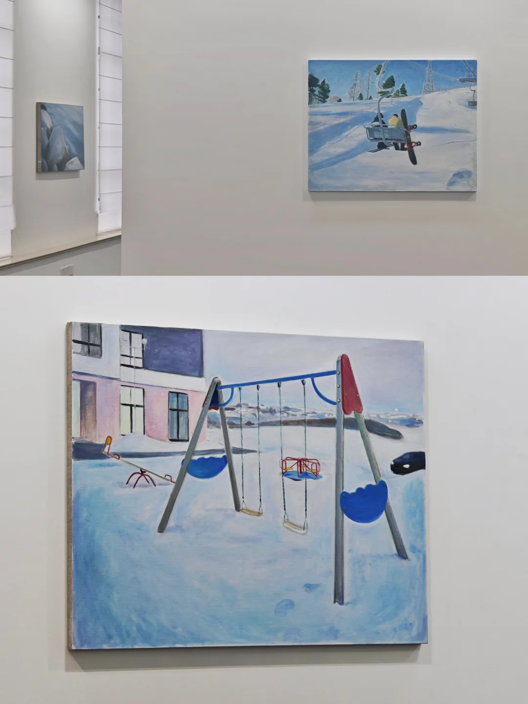 🖼️作品素材源自艺术家近两年来在国内和北欧旅行时拍摄的照片,记录了不同时空的气候与场景,凝结了其生存体验和创作积累。“温差”既是对不同气候素材绘画并置的直白描述,也暗含保持轻盈安静的温度,形成个人风格差异的深层含义。