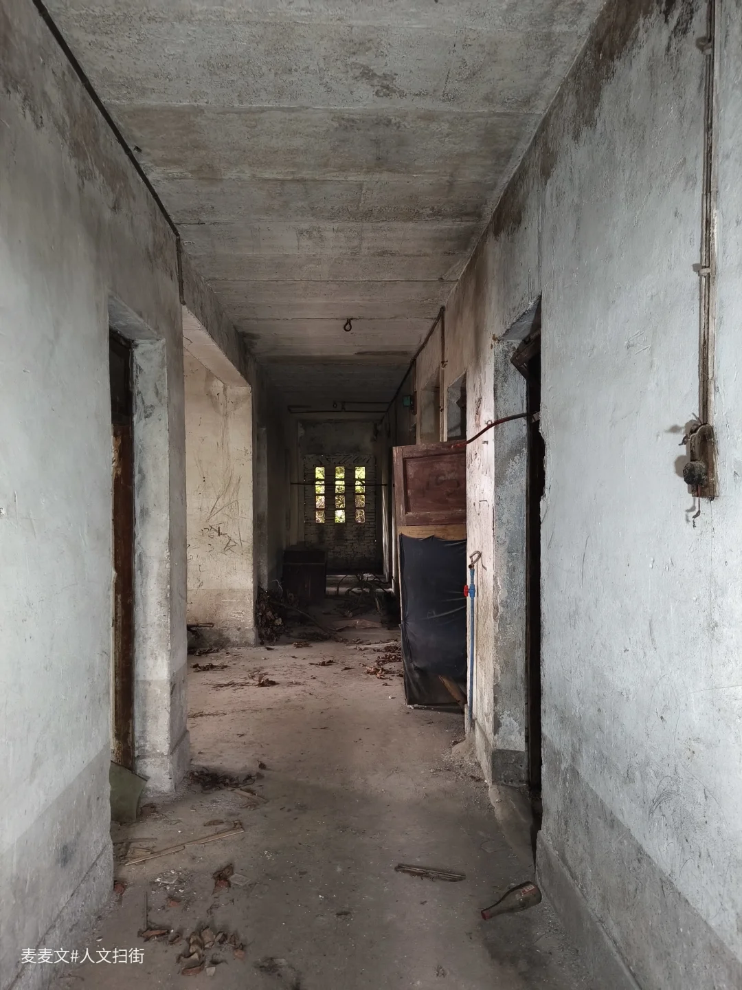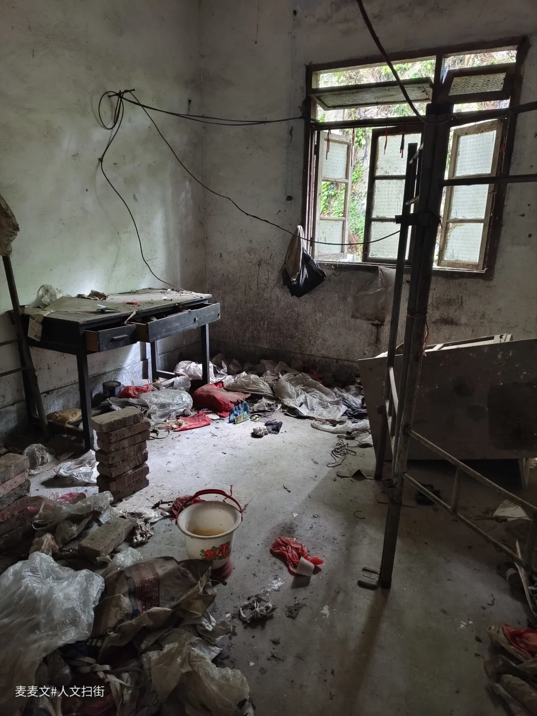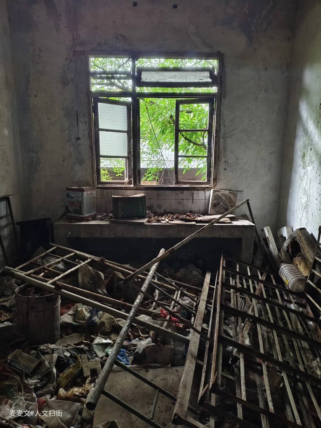 穿过厂区老大门,家属区的轮廓在荒草间若隐若现。厂门一侧,一栋灰白色的旧楼孤零零立着,外墙斑驳,窗框锈蚀,据了解曾是职工医院,如今大门洞开,走廊和房间堆满杂物,消毒水的气味早已消散,只剩霉味混着铁锈味。 拐角处,一栋色彩褪尽的三层矮楼竟还有人居住。曾是幼儿园,如今成了几户工人的蜗居。二楼一户人家的窗外晾着衣服,一个孩子趴在窗边,恍惚间像极了当年在这里玩耍的稚童。