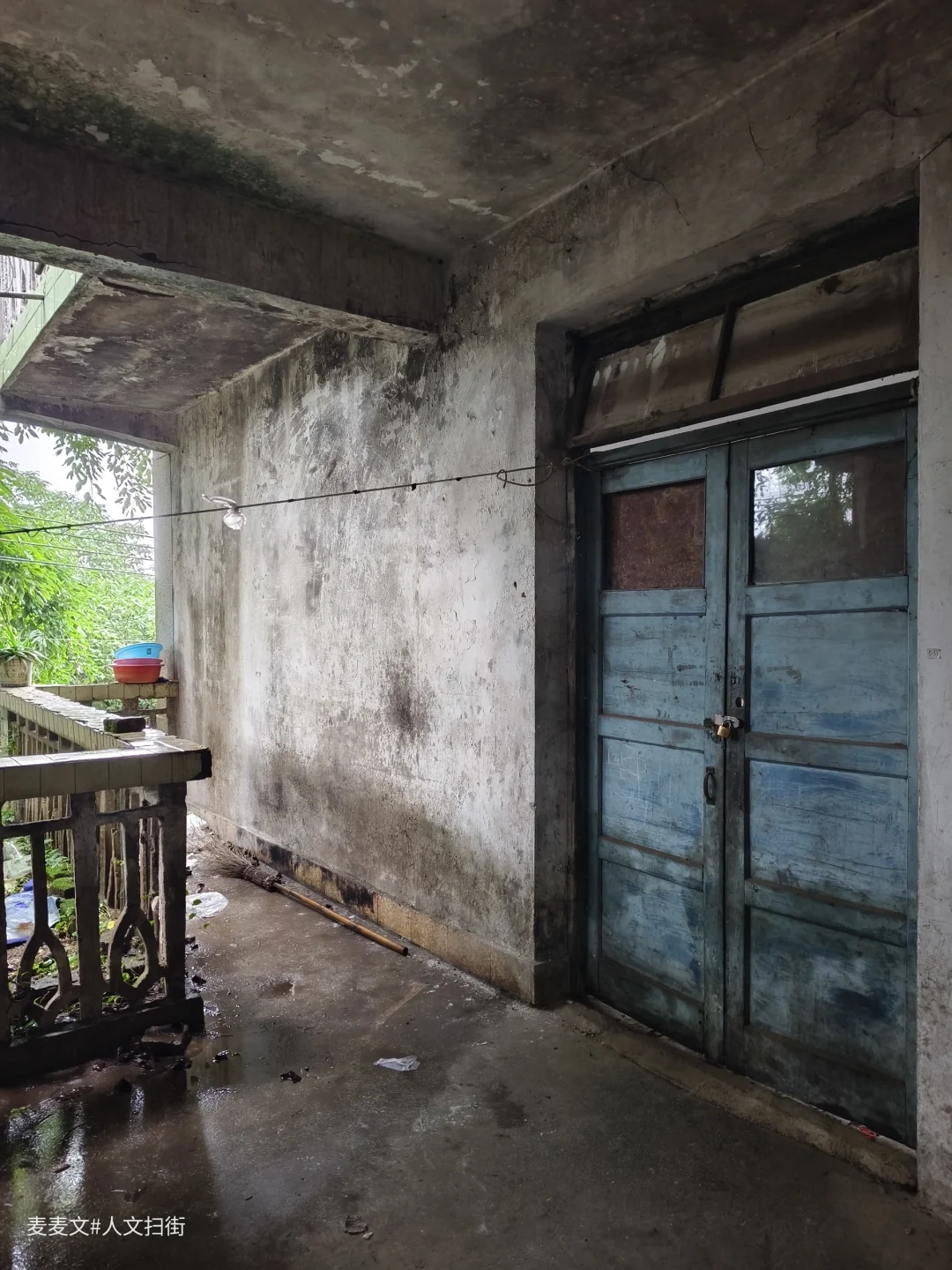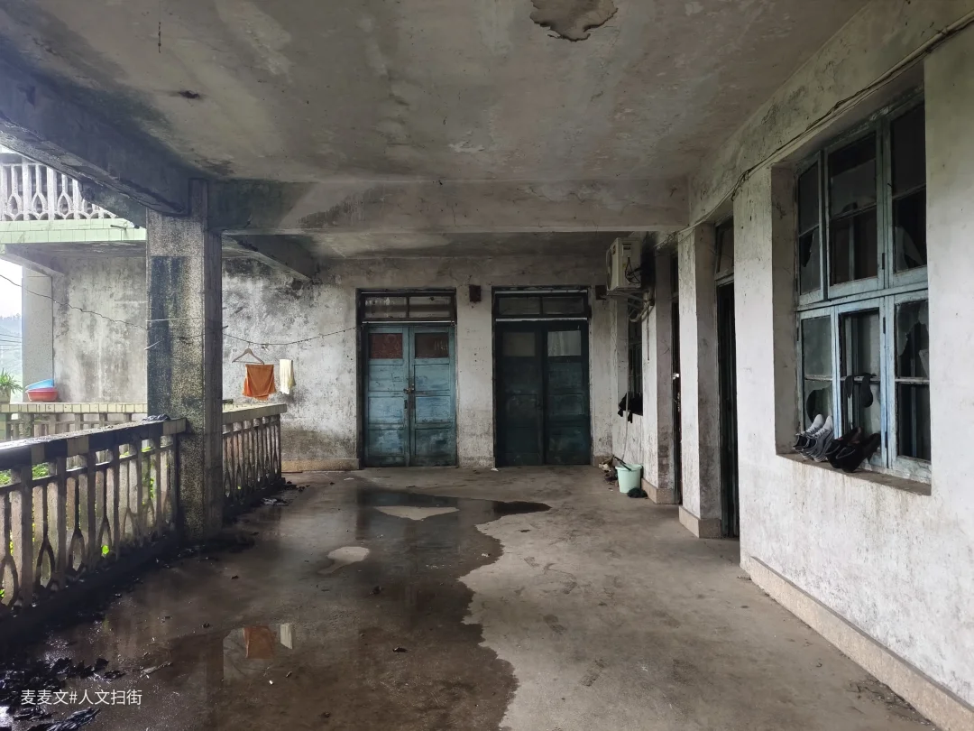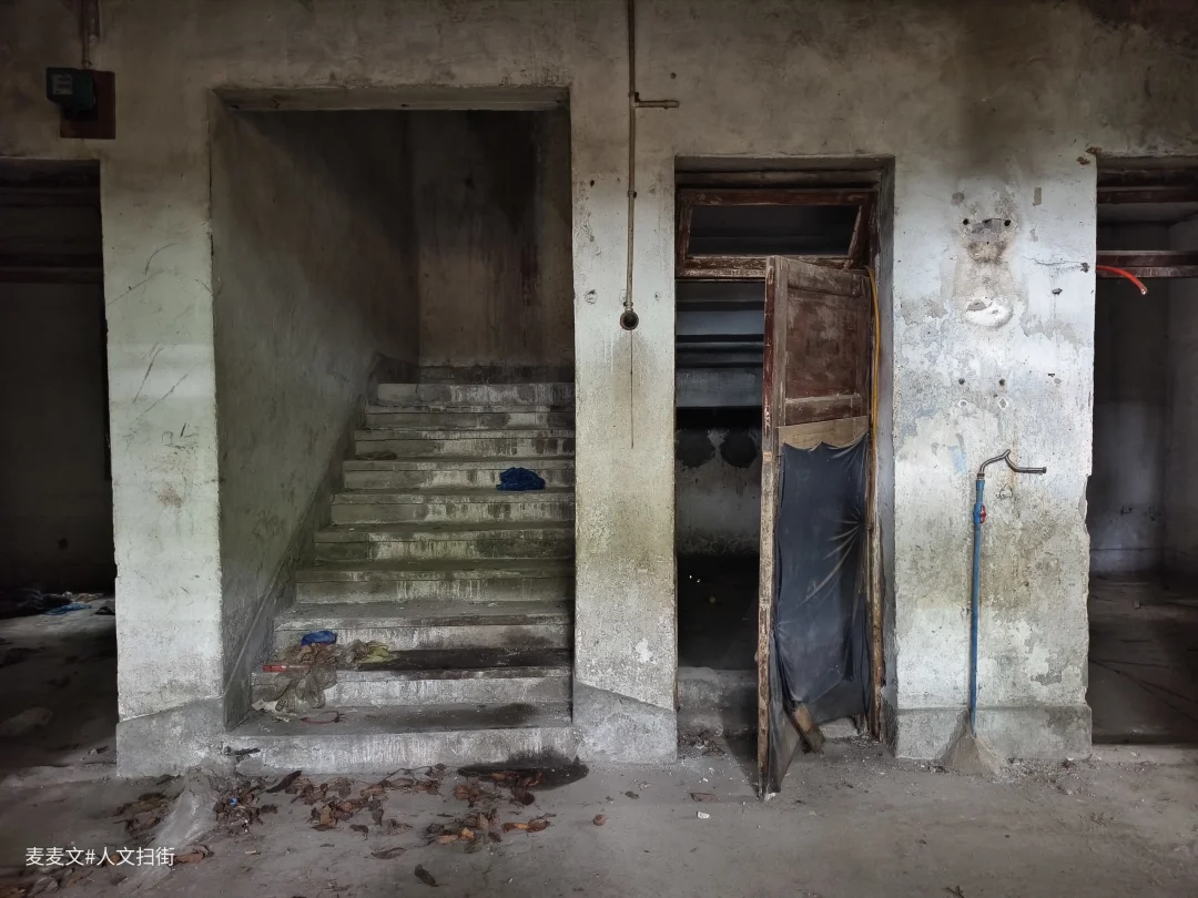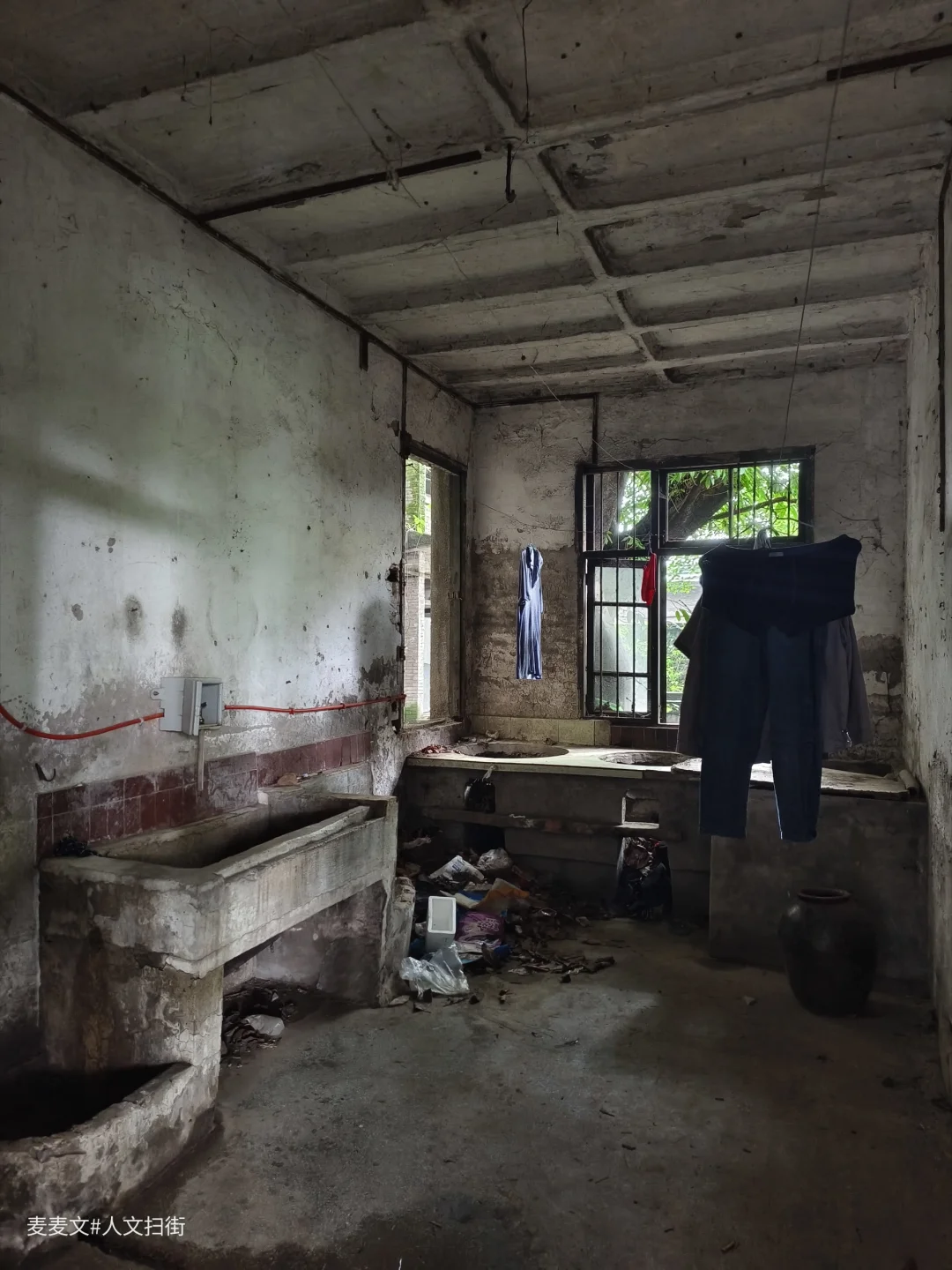 穿过厂区老大门,家属区的轮廓在荒草间若隐若现。厂门一侧,一栋灰白色的旧楼孤零零立着,外墙斑驳,窗框锈蚀,据了解曾是职工医院,如今大门洞开,走廊和房间堆满杂物,消毒水的气味早已消散,只剩霉味混着铁锈味。 拐角处,一栋色彩褪尽的三层矮楼竟还有人居住。曾是幼儿园,如今成了几户工人的蜗居。二楼一户人家的窗外晾着衣服,一个孩子趴在窗边,恍惚间像极了当年在这里玩耍的稚童。
