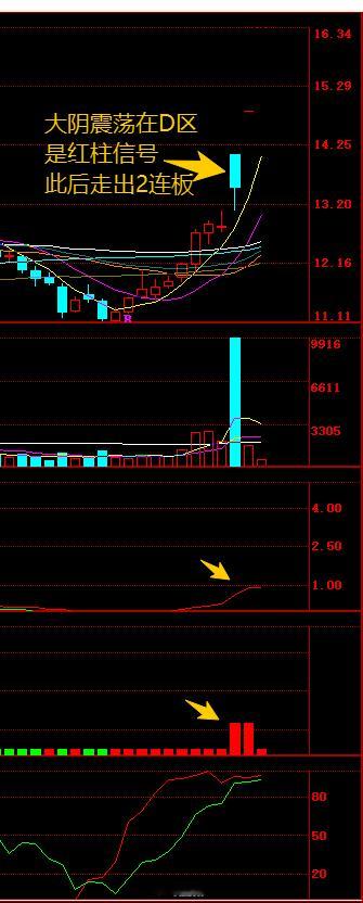 指标讲解软件 图一这样的信号,可不可以博?放量大阴震荡,一般都认为是埋人的走法。但是如果放量大阴,在榜主信号上显示是较大红柱信号,那还是可以博一下的,特别如果是在D区的,博成的概率还是高的。但如果在C区,那就不要博,等第二天走出来再看,如果第二天是高开的,又出红柱信号,那就可以参与,如果不是,那就放弃。如图示所示,这票在D区,大阴震荡这天是中小红柱信号,所以,如果去博一下,后面给了两个点式的涨停,收获还是很大的。