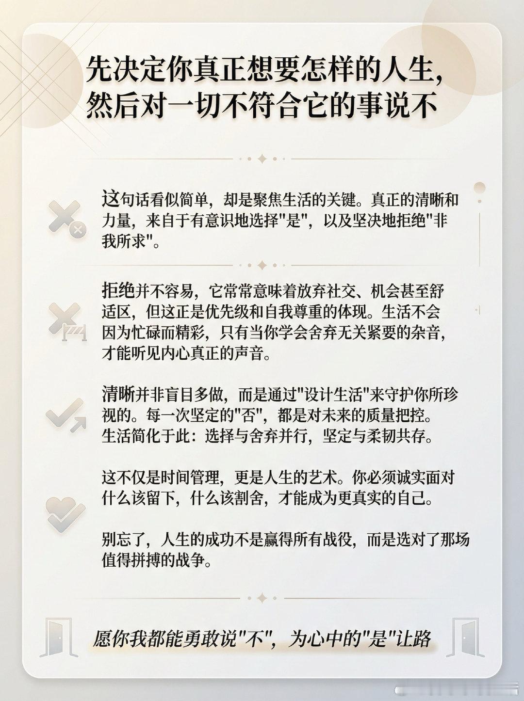 “先决定你真正想要怎样的人生,然后对一切不符合它的事说不。” 这句话看似简单,却是聚焦生活的关键。真正的清晰和力量,来自于有意识地选择“是”,以及坚决地拒绝“非我所求”。 拒绝并不容易,它常常意味着放弃社交、机会甚至舒适区,但这正是优先级和自我尊重的体现。生活不会因为忙碌而精彩,只有当你学会舍弃无关紧要的杂音,才能听见内心真正的声音。 清晰并非盲目多做,而是通过“设计生活”来守护你所珍视的。每一次坚定的“否”,都是对未来的质量把控。生活简化于此:选择与舍弃并行,坚定与柔韧共存。 这不仅是时间管理,更是人生的艺术。你必须诚实面对什么该留下,什么该割舍,才能成为更真实的自己。 别忘了,人生的成功不是赢得所有战役,而是选对了那场值得拼搏的战争。 愿你我都能勇敢说“不”,为心中的“是”让路。 x.com/Jayyanginspires/status/1999534937939263956
